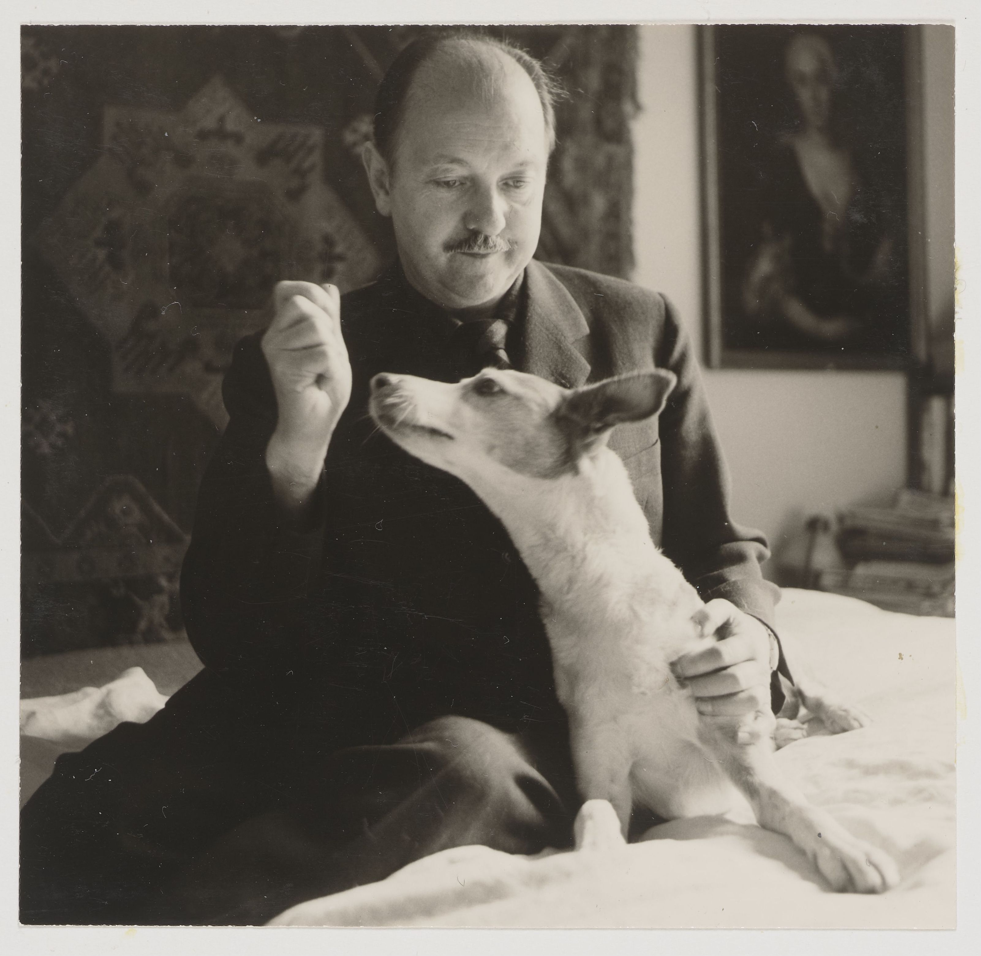 [Portrait Walter Kreis und Hund im Bett]