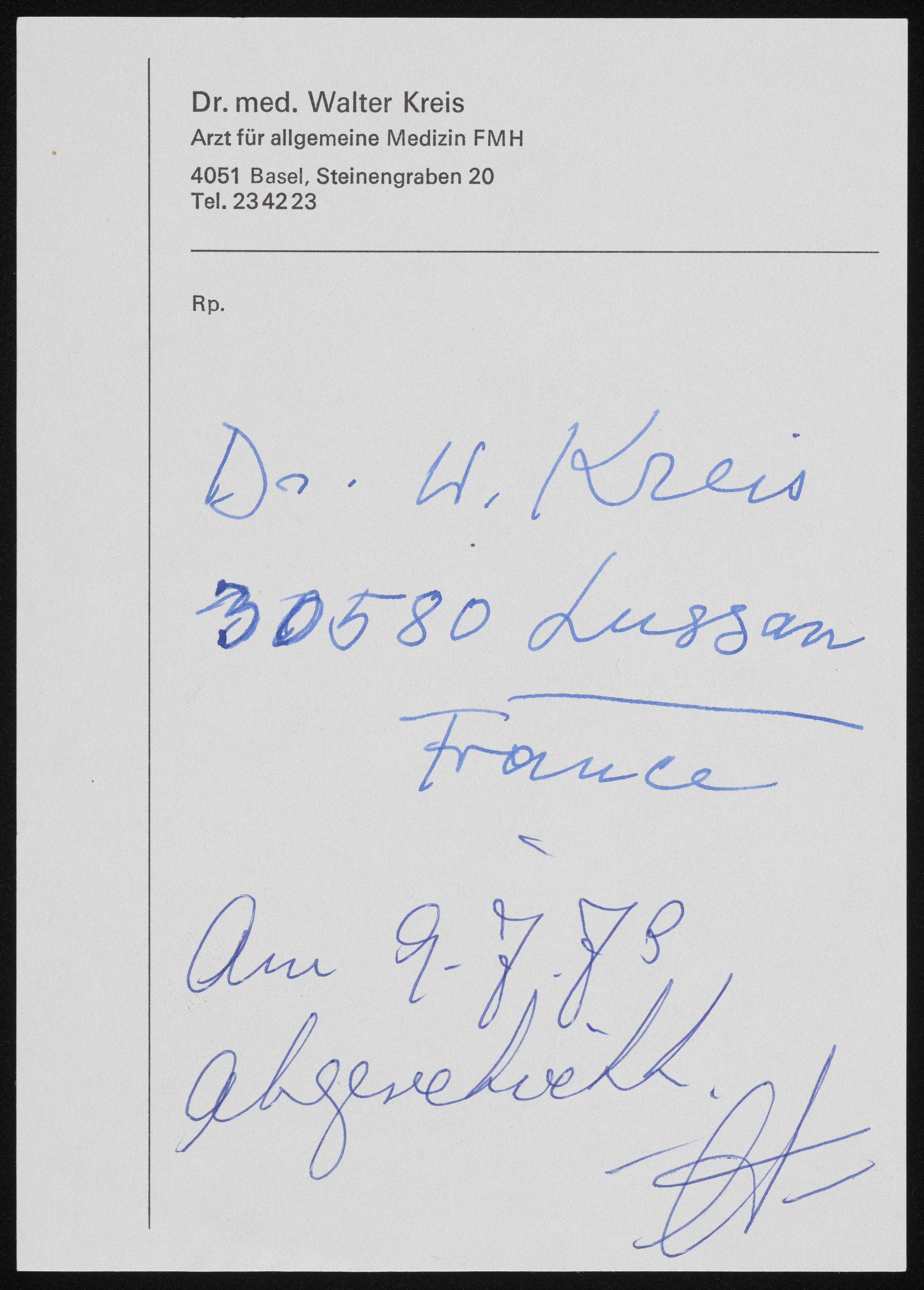 [Ärztlicher Rezeptzettel Walter Kreis mit Notiz]
