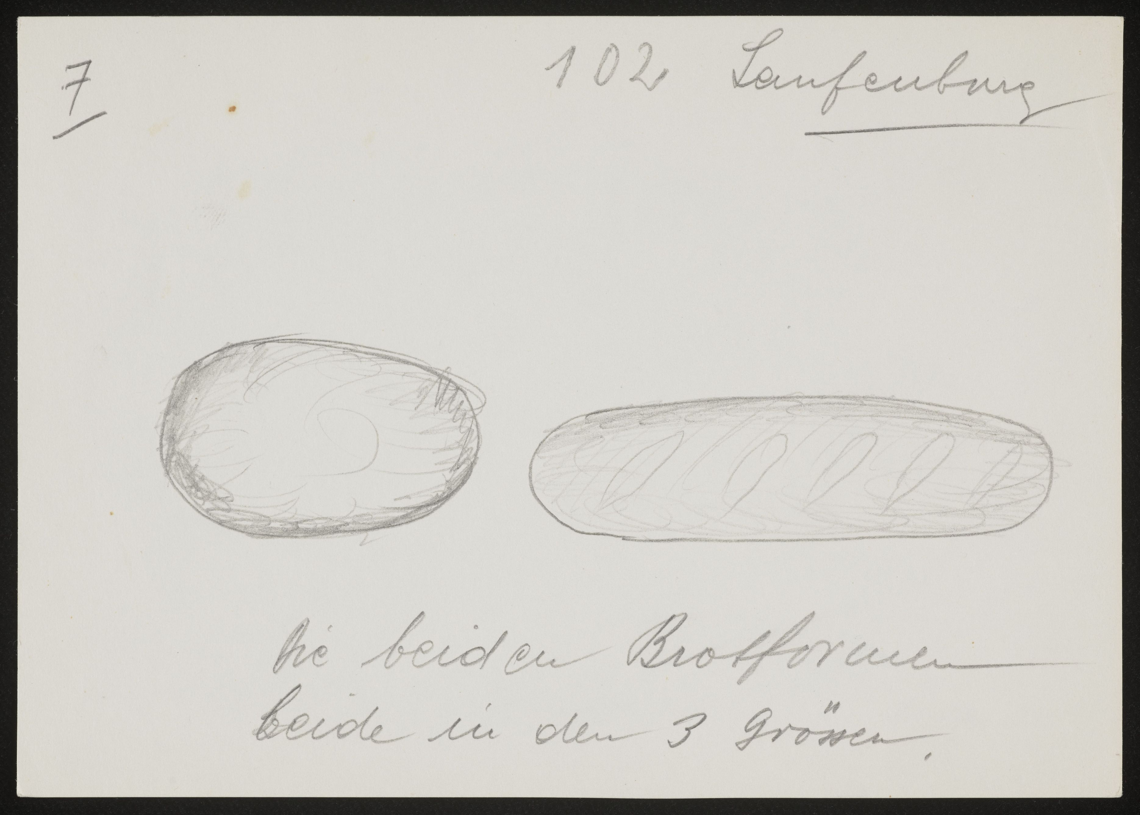 [Brot-Skizzen mit dem Kommentar "Die beiden Brotformen beide in den 3 Grössen."]