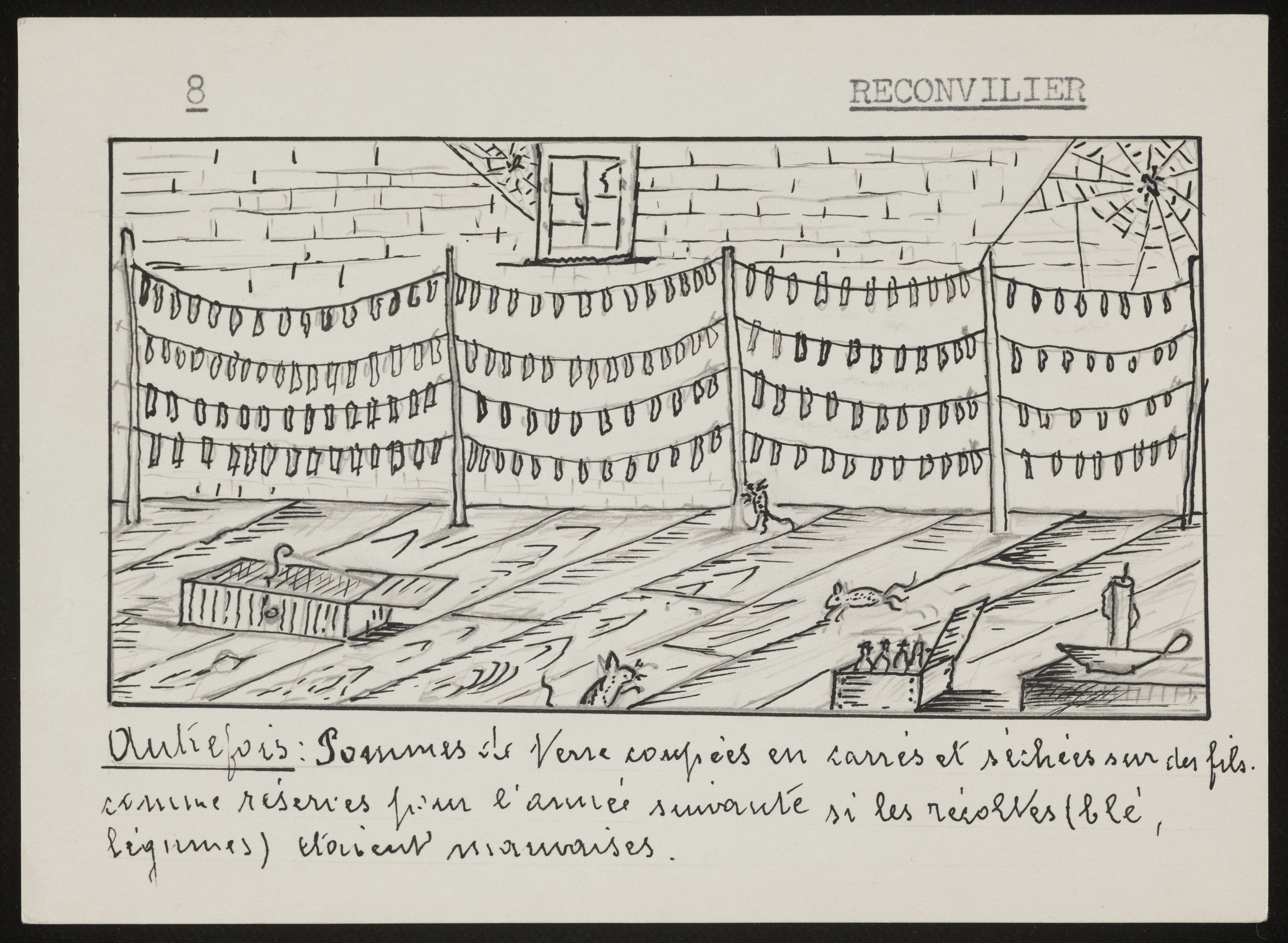 [Zeichnung mit dem Kommentar: "Autrefois: Pommes de terre coupées en carrés et sèchées sur un fils comme réserve pour l'année suivante si les récoltes (blé. légumes) etaient mauvaises."]