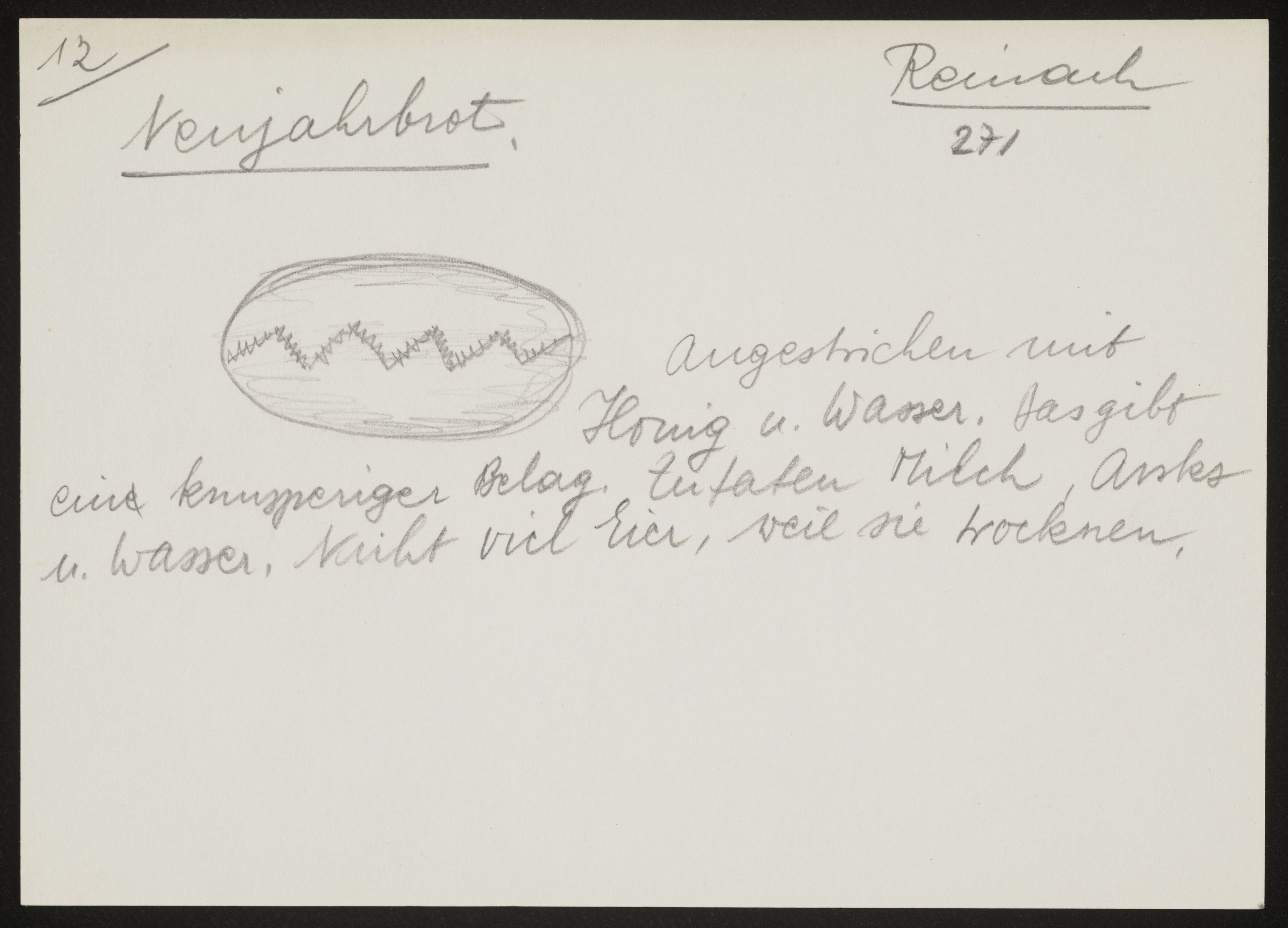 ["Neujahrbrot"-Skizze mit dem Kommentar: "Angestrichen mit Honig u. Wasser. Das gibt ein knuspriger Belag. Zutaten Milch, Anks u. Wasser. Nicht viel Eier, weil sie trocknen. "]