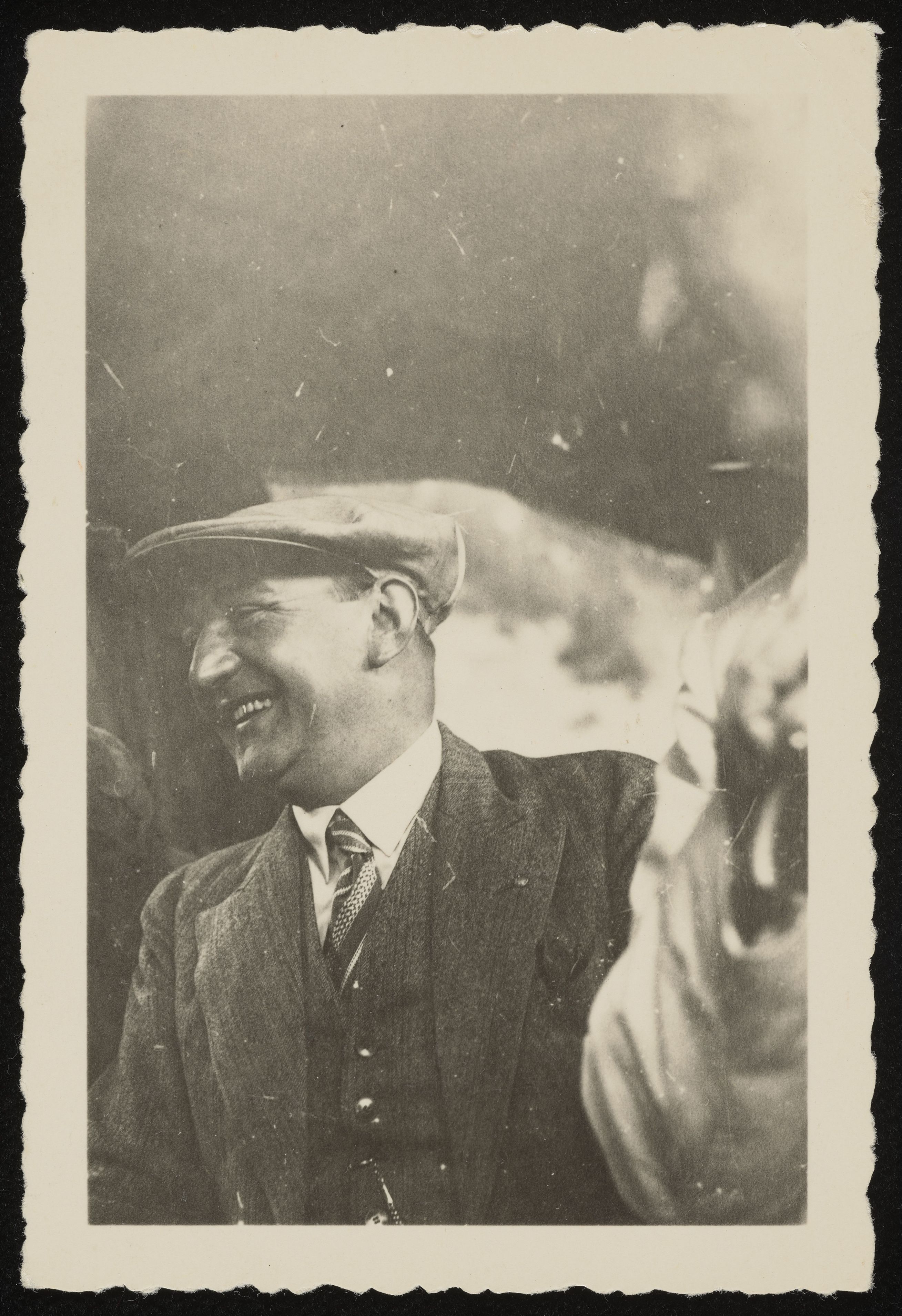 [Lachender Mann mit Anzug und Schiebermütze]