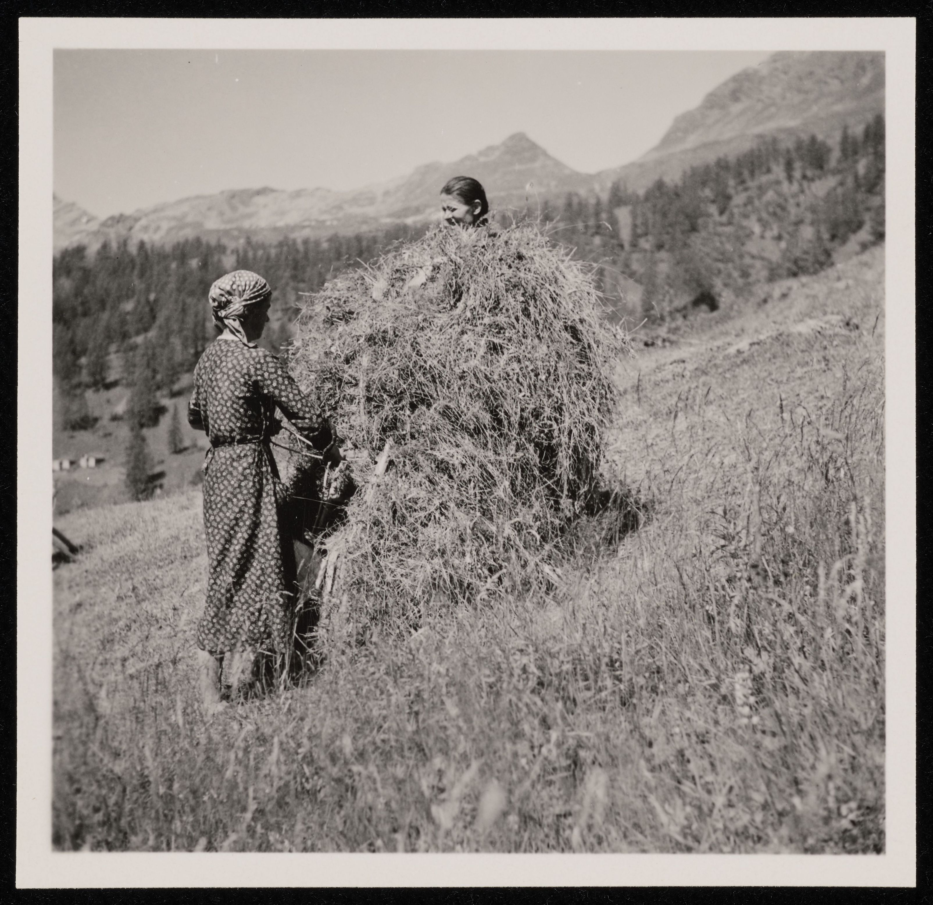 [Bosco Frauen bündeln Heu und laden es auf Rückentrage]