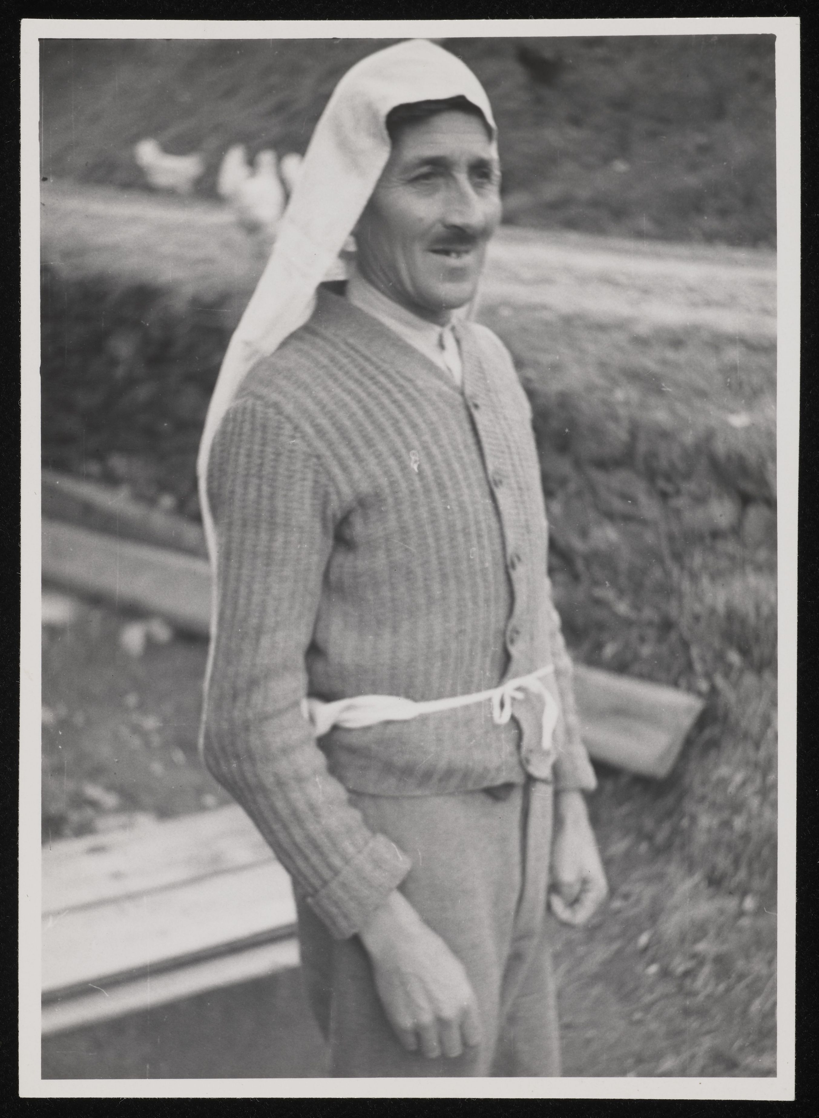 [Foto Sprachatlas d. dt. Schweiz: Mann mit "Heuchappä" Heukappe in Valzeina GR]
