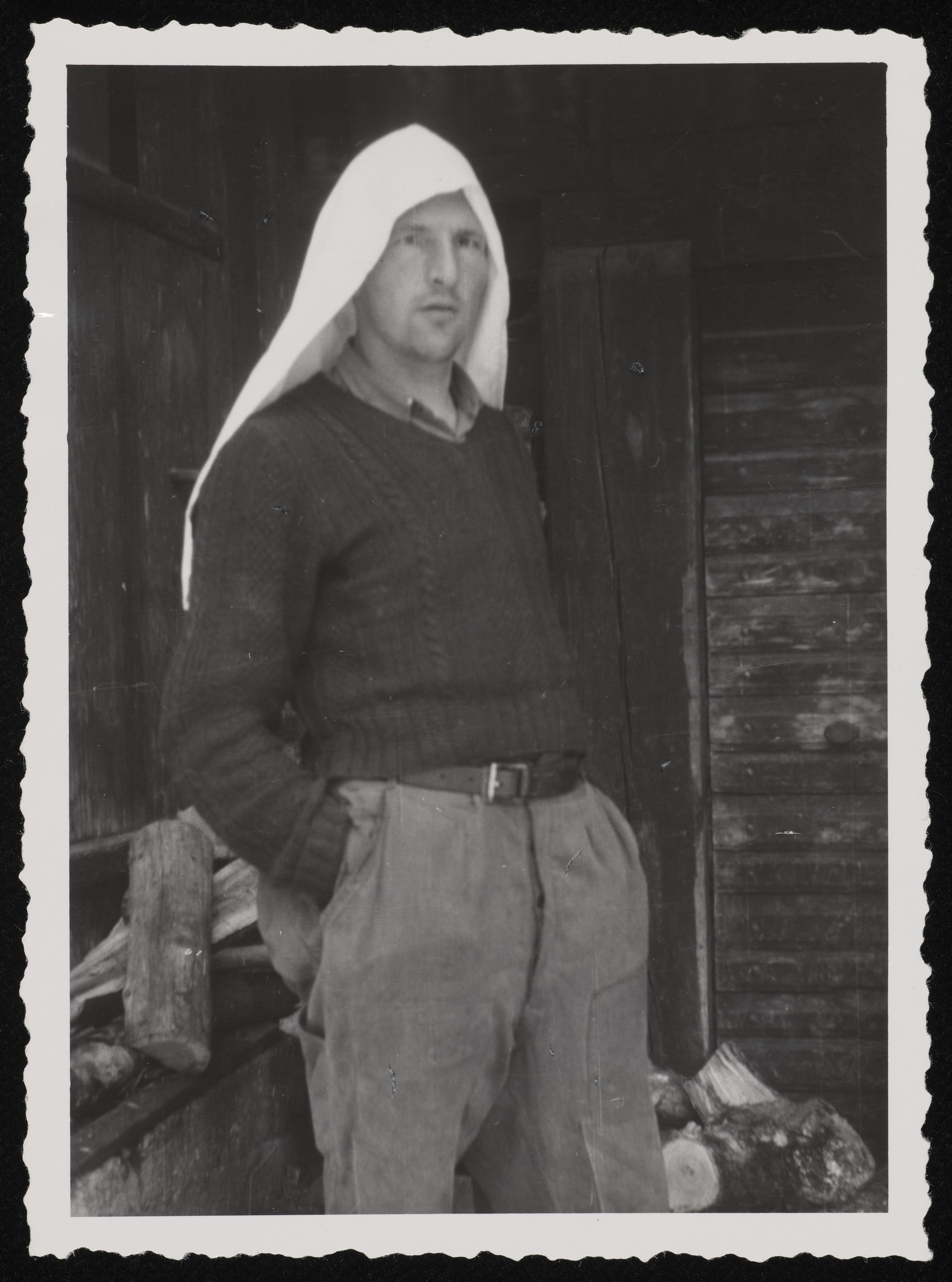 [Foto Sprachatlas d. dt. Schweiz: Mann mit "Tragsack" Kopfbedeckung (Heuen?) Ferden (Lötschental)]