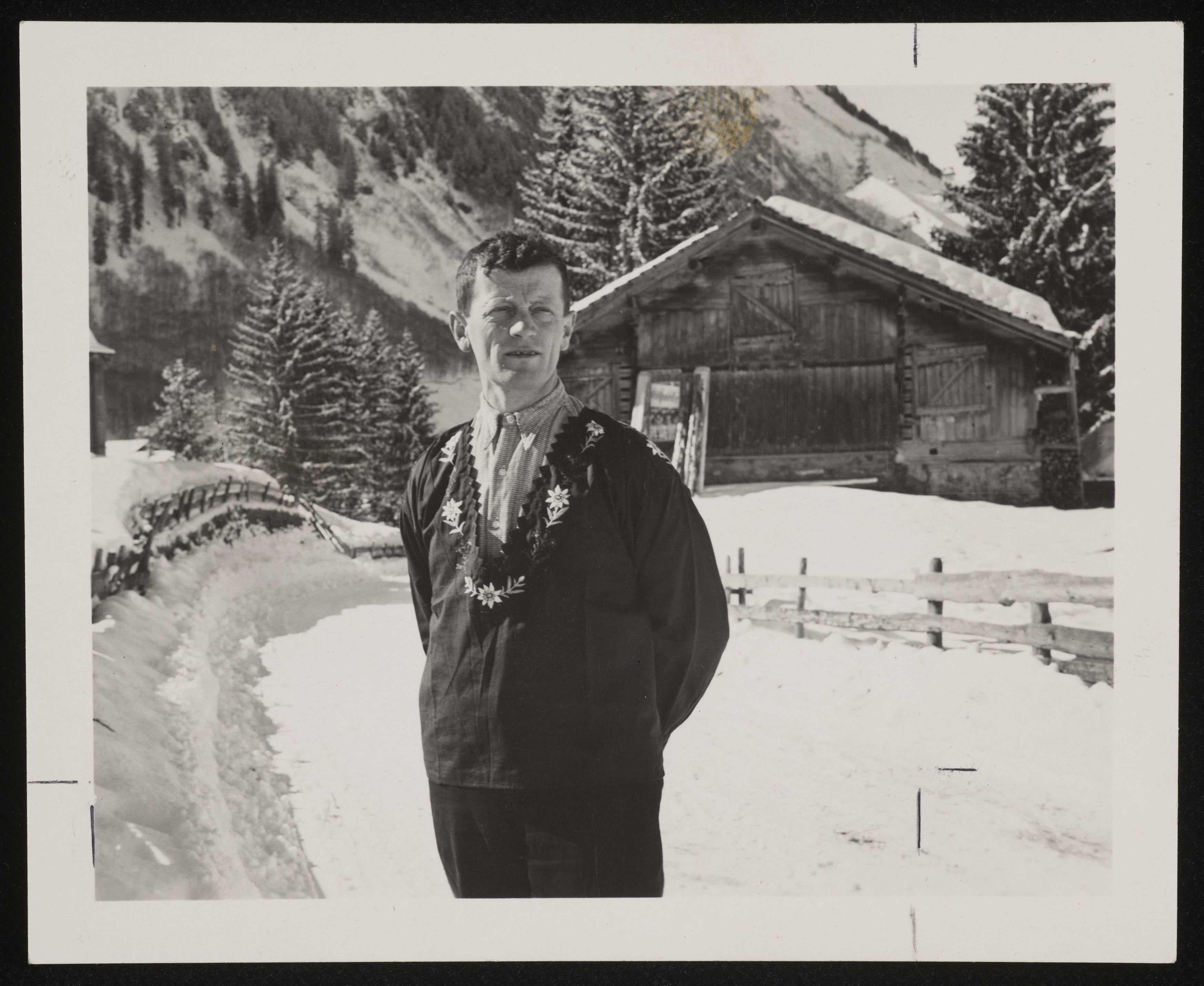 [Mann in Winterlandschaft in Unterschächen trägt ein mit Stickereien verziertes Überhemd]