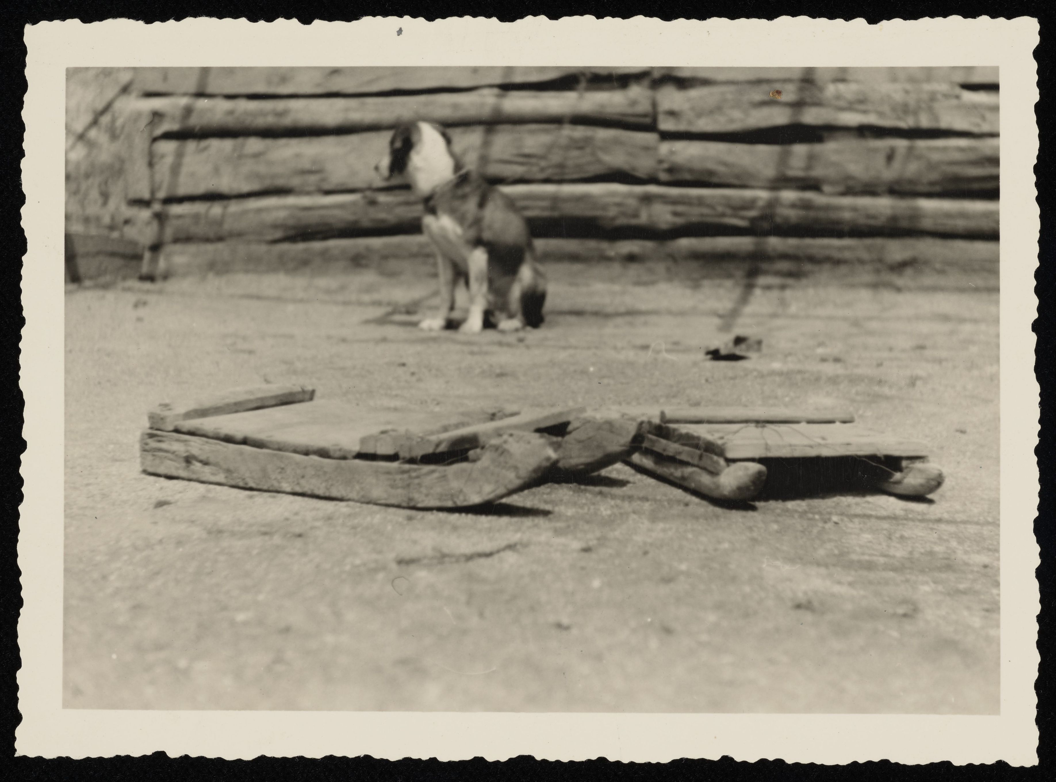 [Zwei flache Schlitten vor Hund]