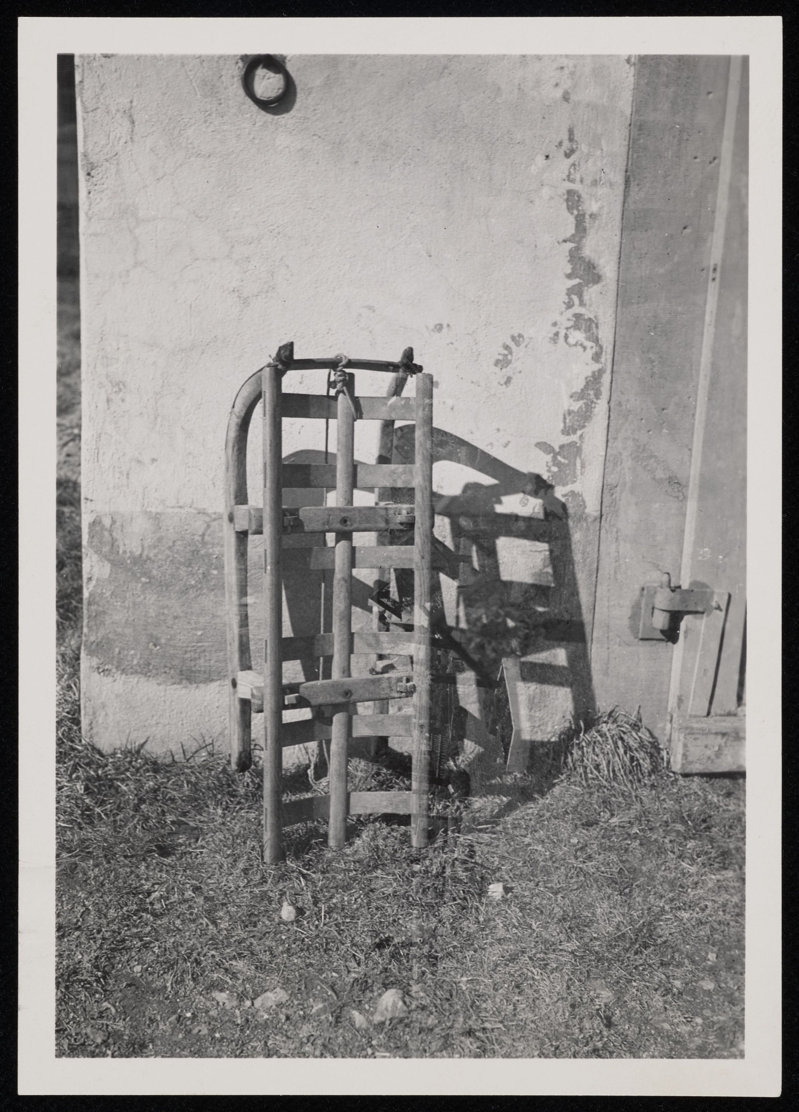 [Schlitten an Wand gelehnt]