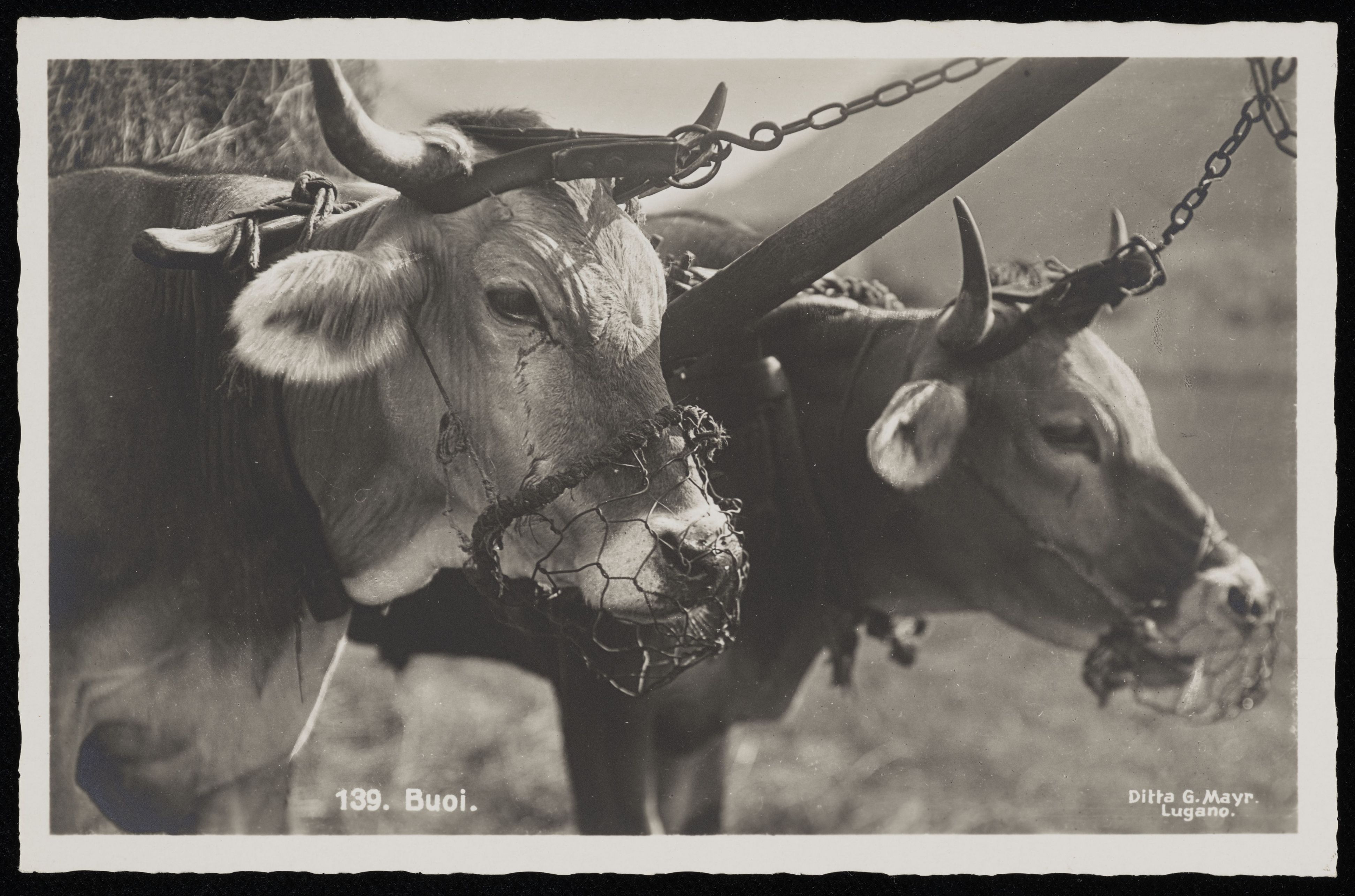 [Nahaufnahme Kühe mit Joch und Mundkorb]