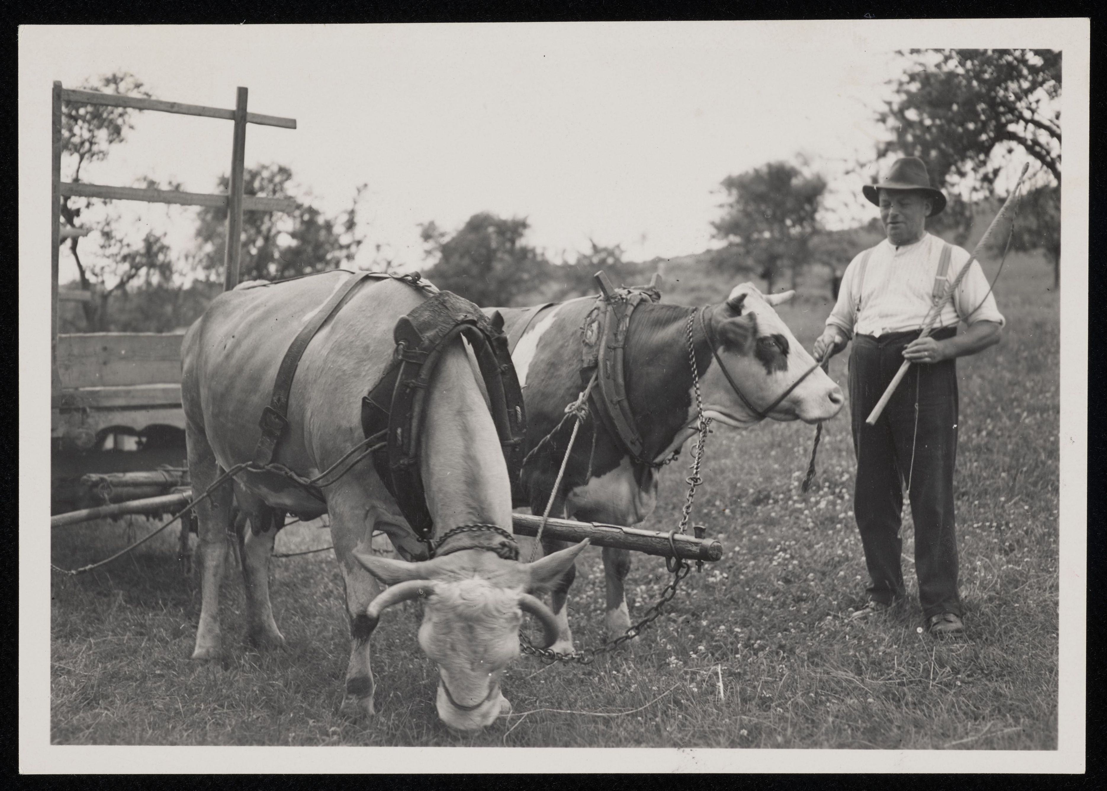 [Mann mit Vieh und Ochsenkarre auf der Wiese]