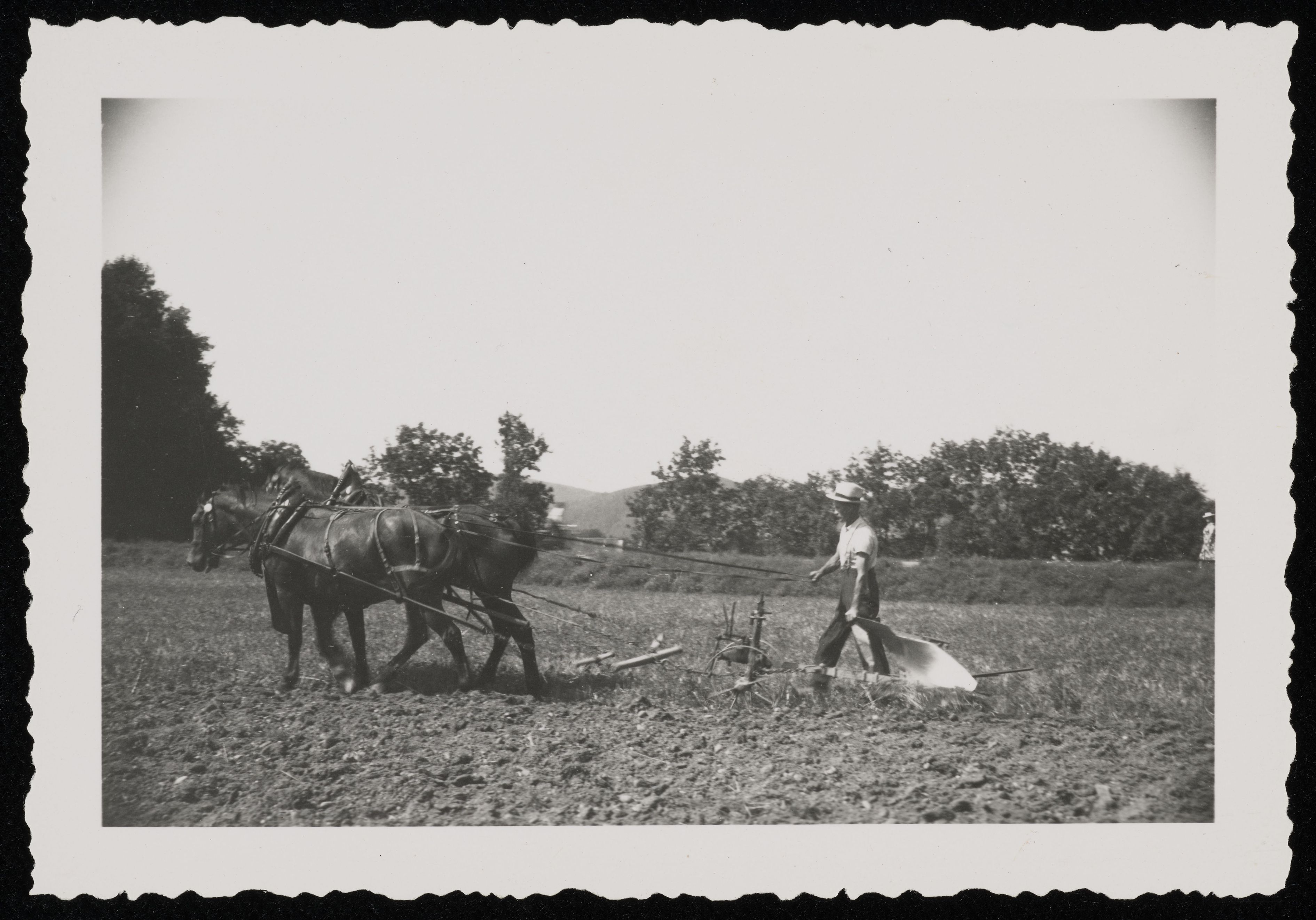 [Mann mit Pferd und Pflug auf dem Feld]