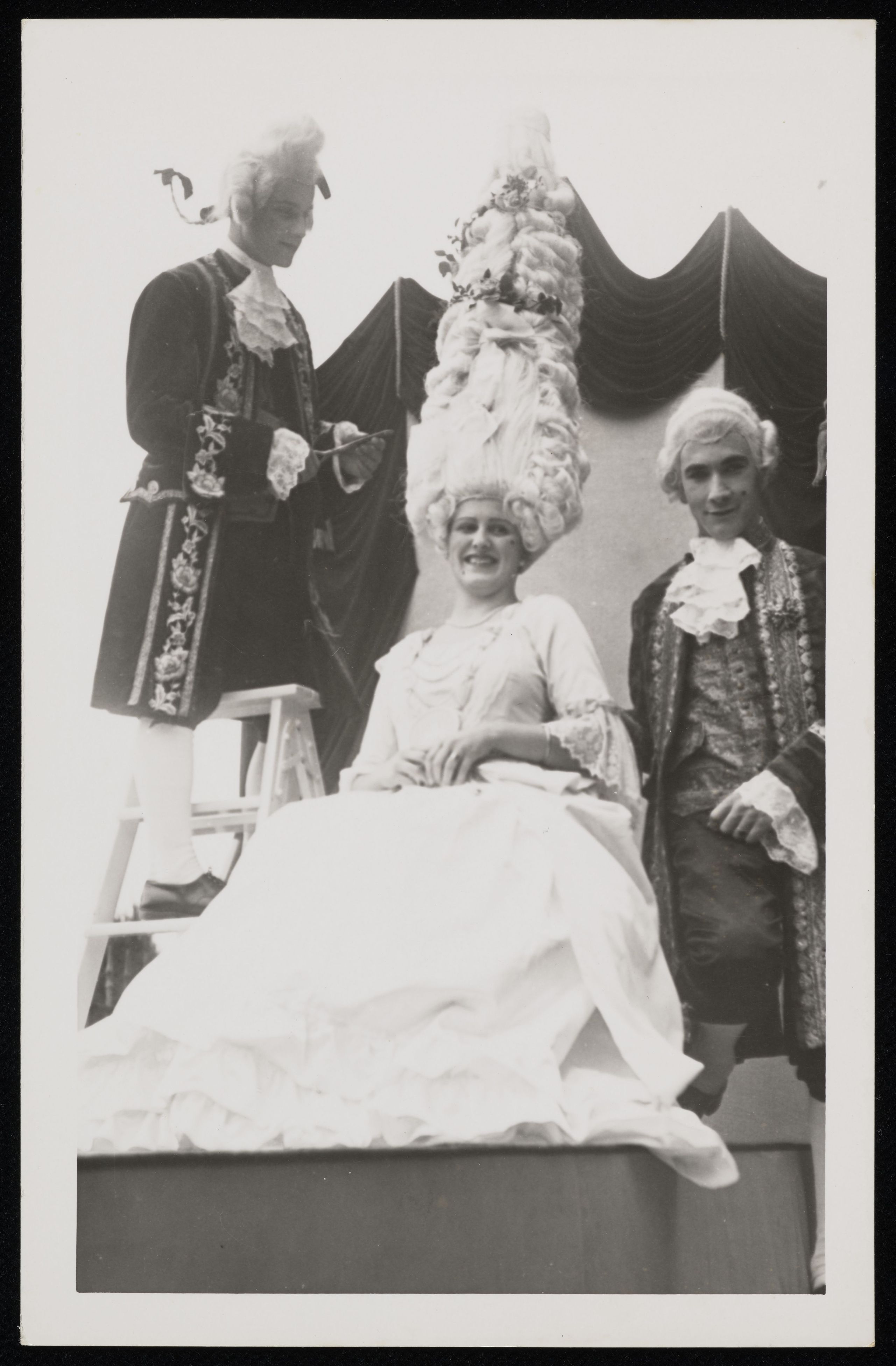 [Drei Personen mit Kostümen und Perücken]