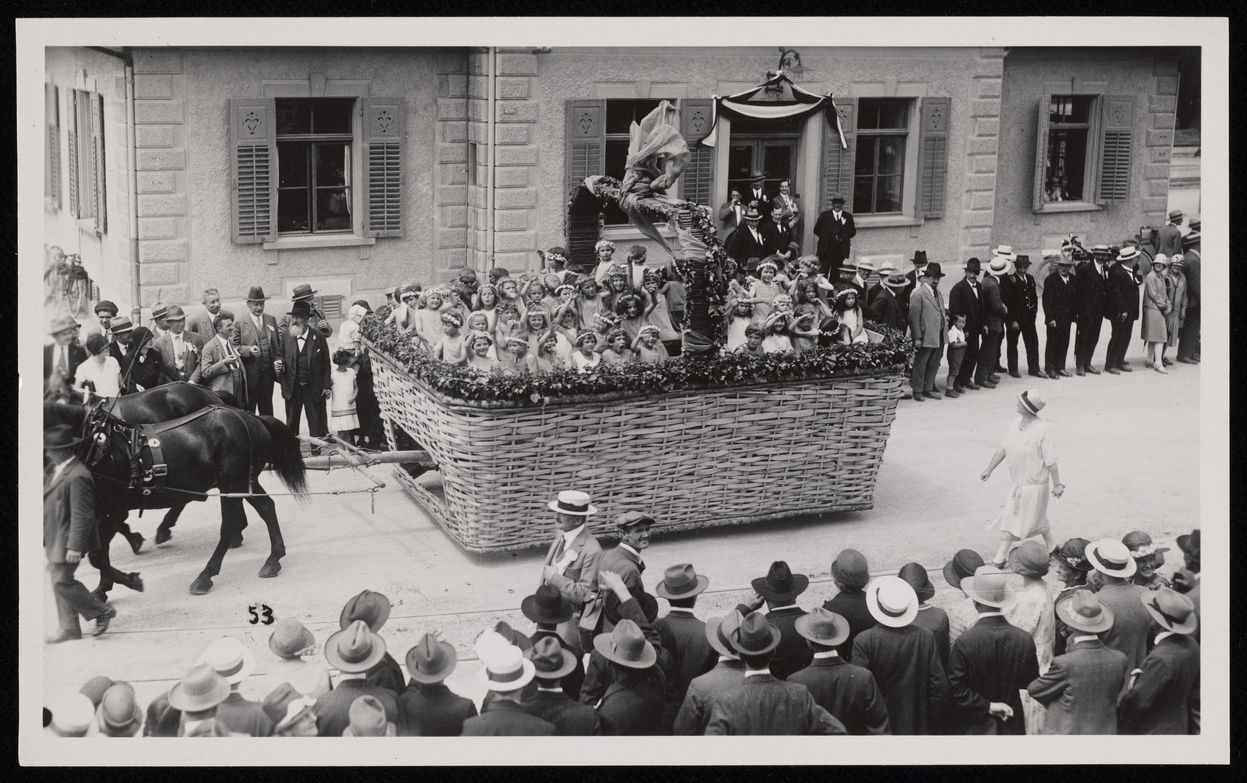 [Kinder in einem Wagen, Umzug mit Publikum am Sängerfest in Baar 1927]