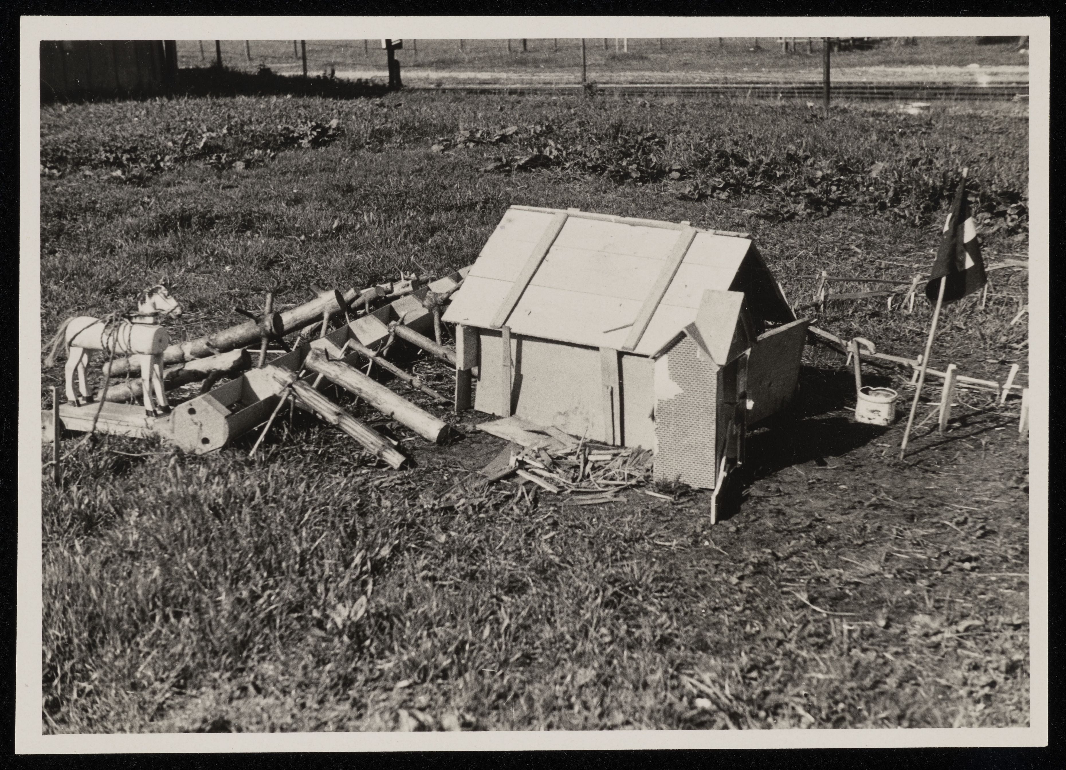 [kleines Spielhaus mit Zaun, Schweizerfahne und Spielpferd]