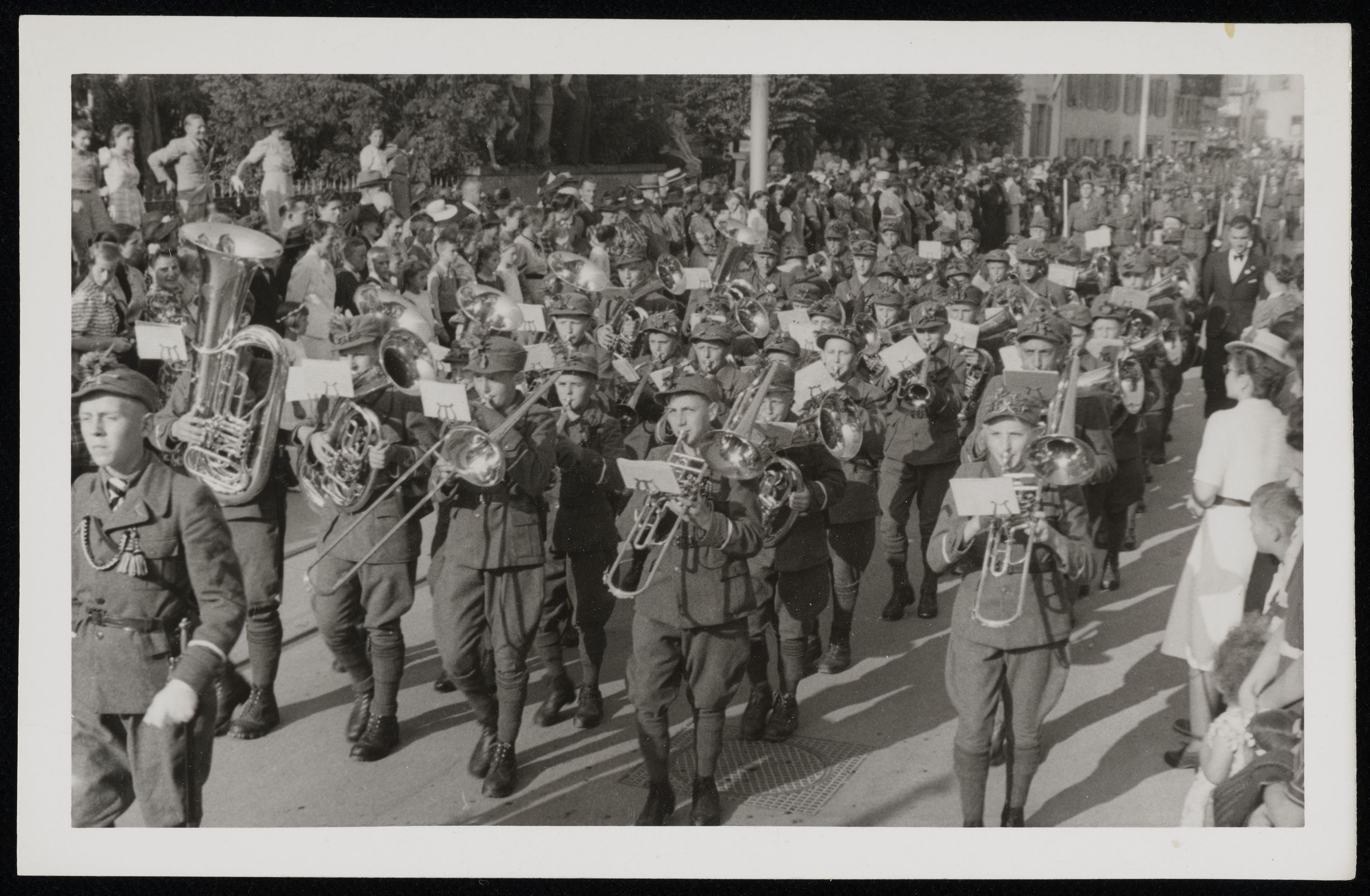 [Personen mit Blasinstrumenten marschieren durch Strasse]