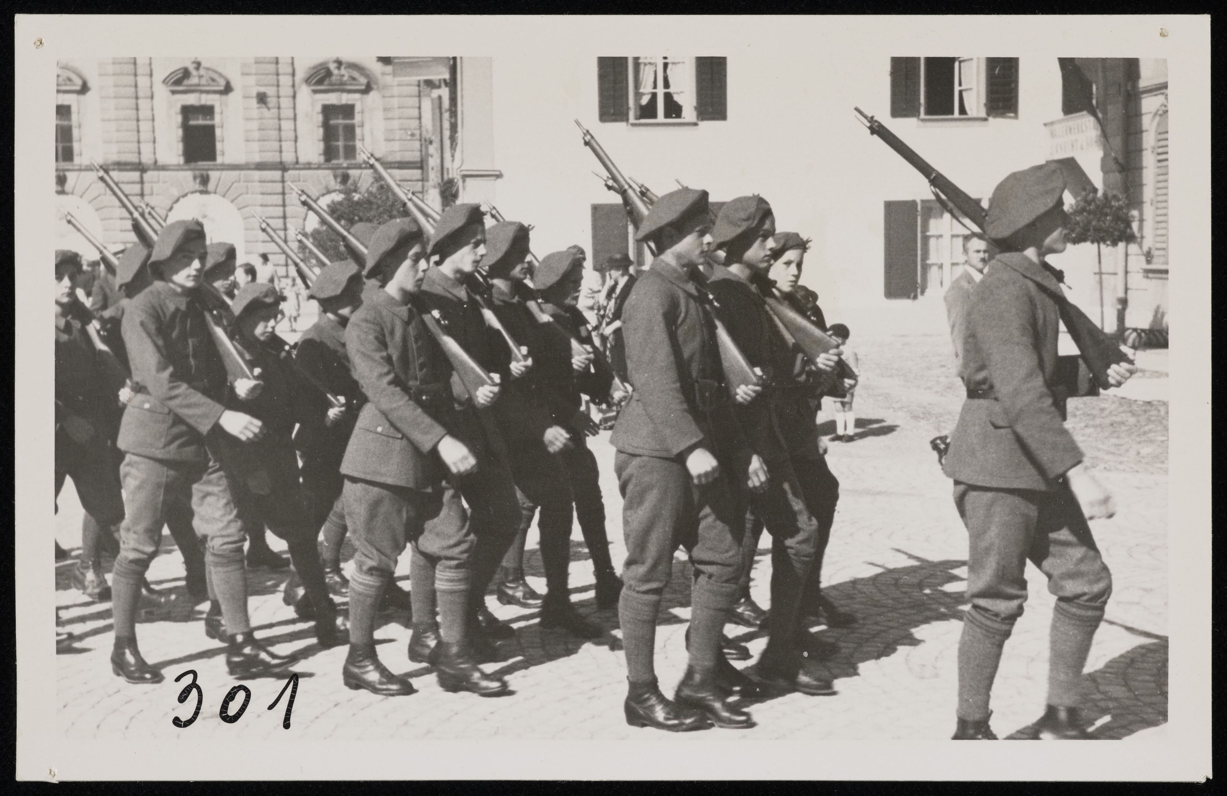 [Kadettenkorps in Uniform mit geschultertem Gewehr an Umzug]
