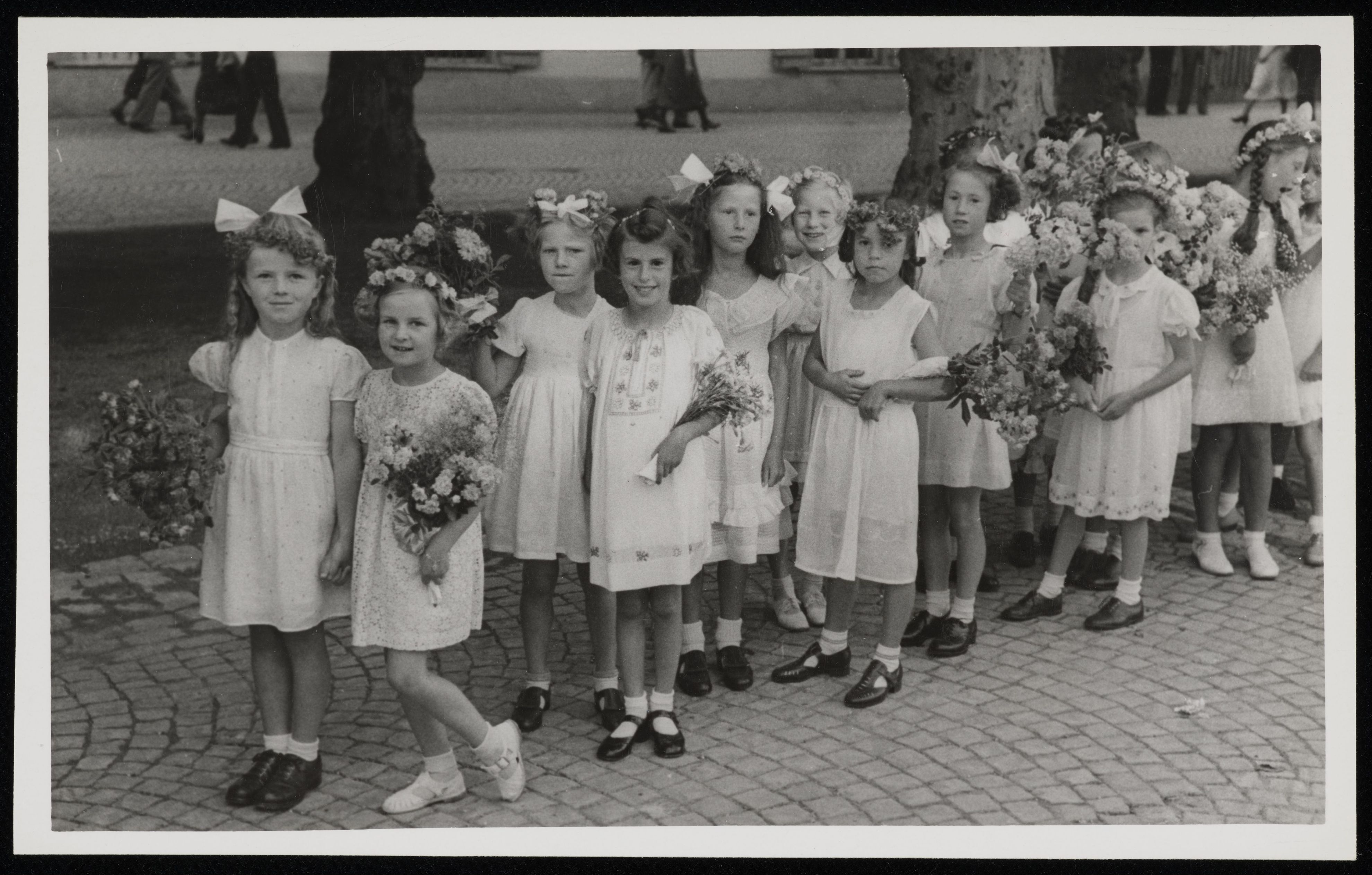 [Kinder in weissen Kleidern mit Blumen in den Händen stehen in Zweierreihe]
