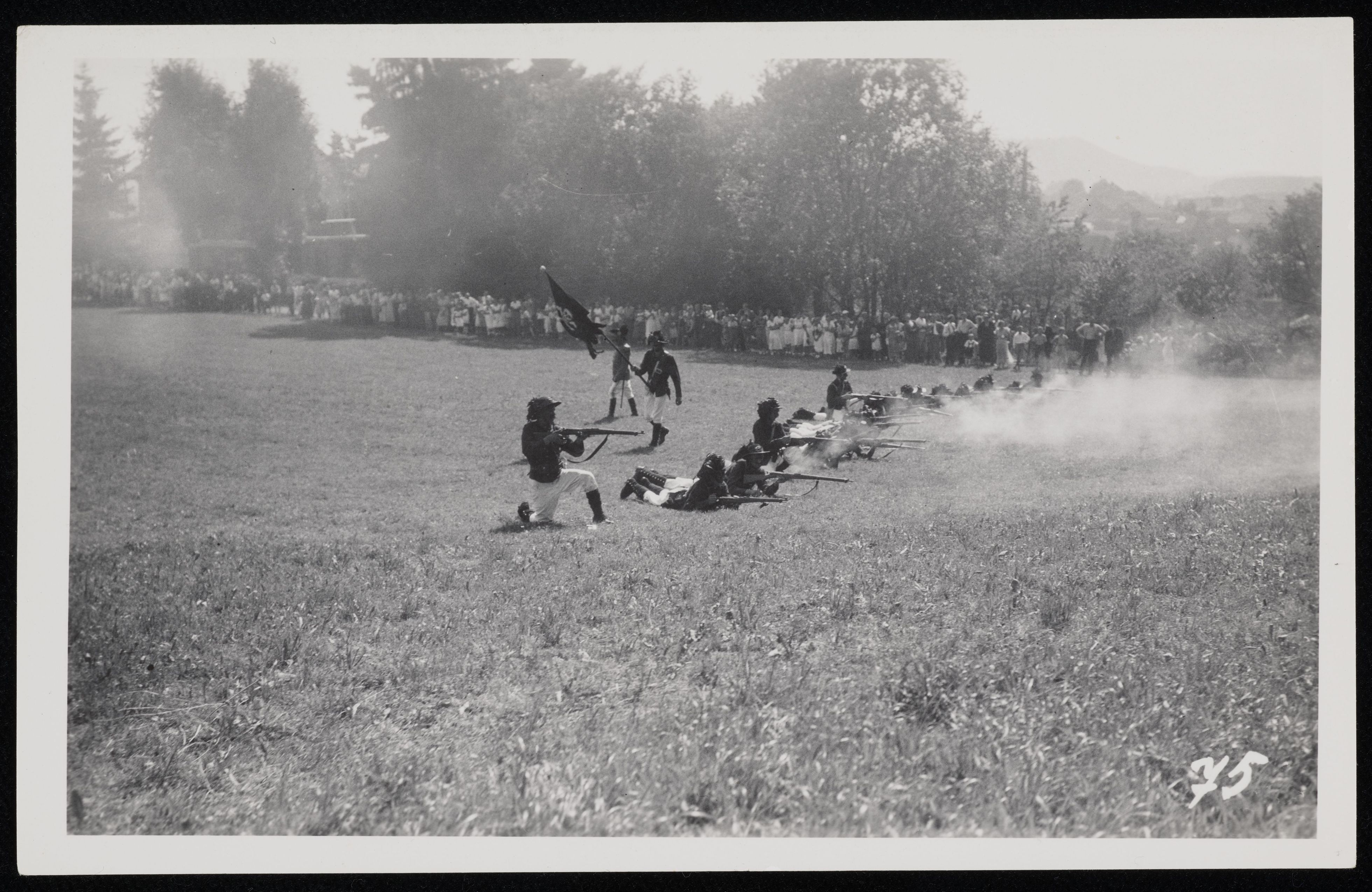 [Jugendliche spielen Freischarenmanöver nach]