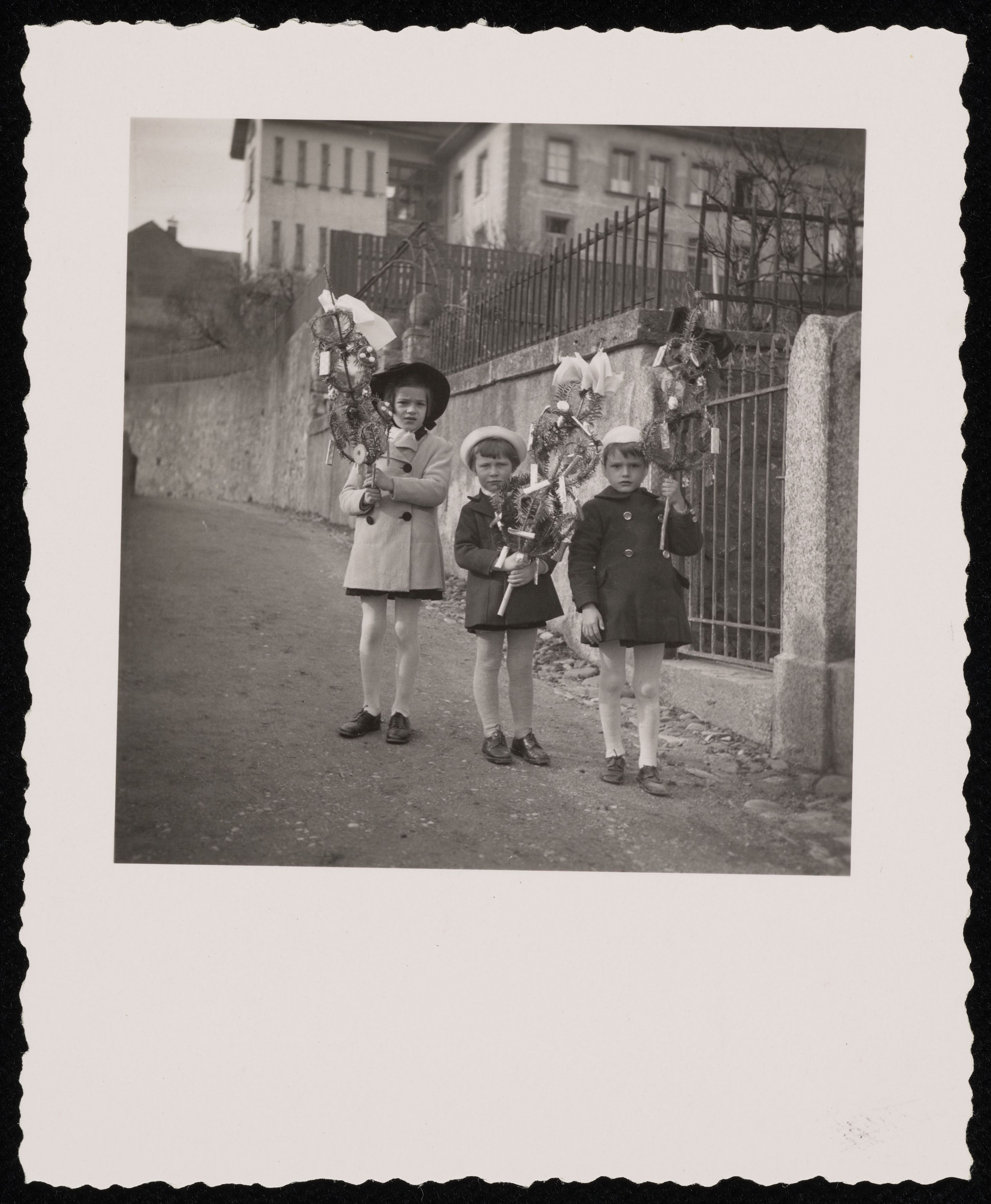 [Drei Kinder mit Rameaux-Zweigen auf Strasse]