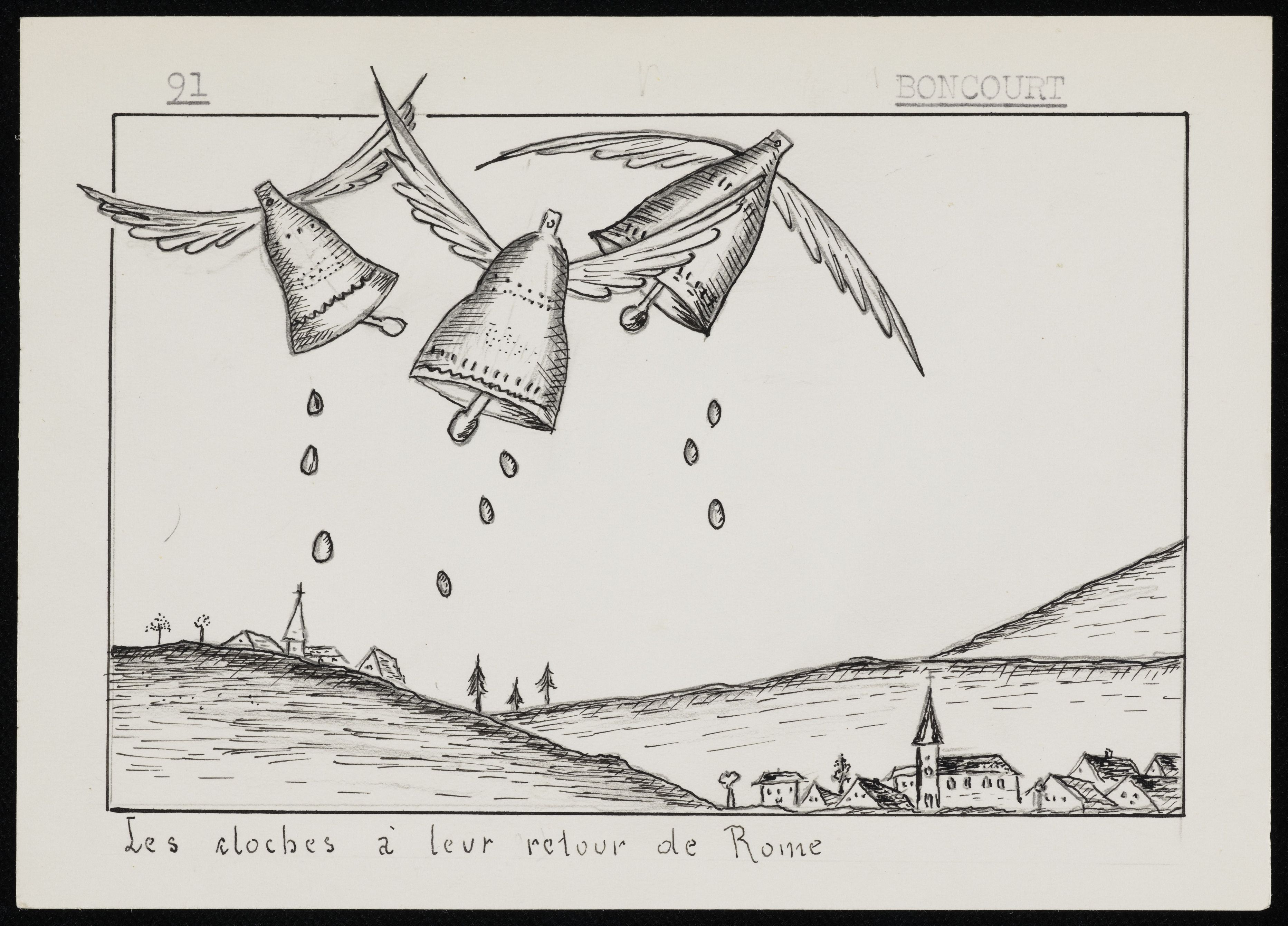 [Zeichnung Boncourt Anspielung auf Rückkehr der Kirchenglocken am Ostersonntag]