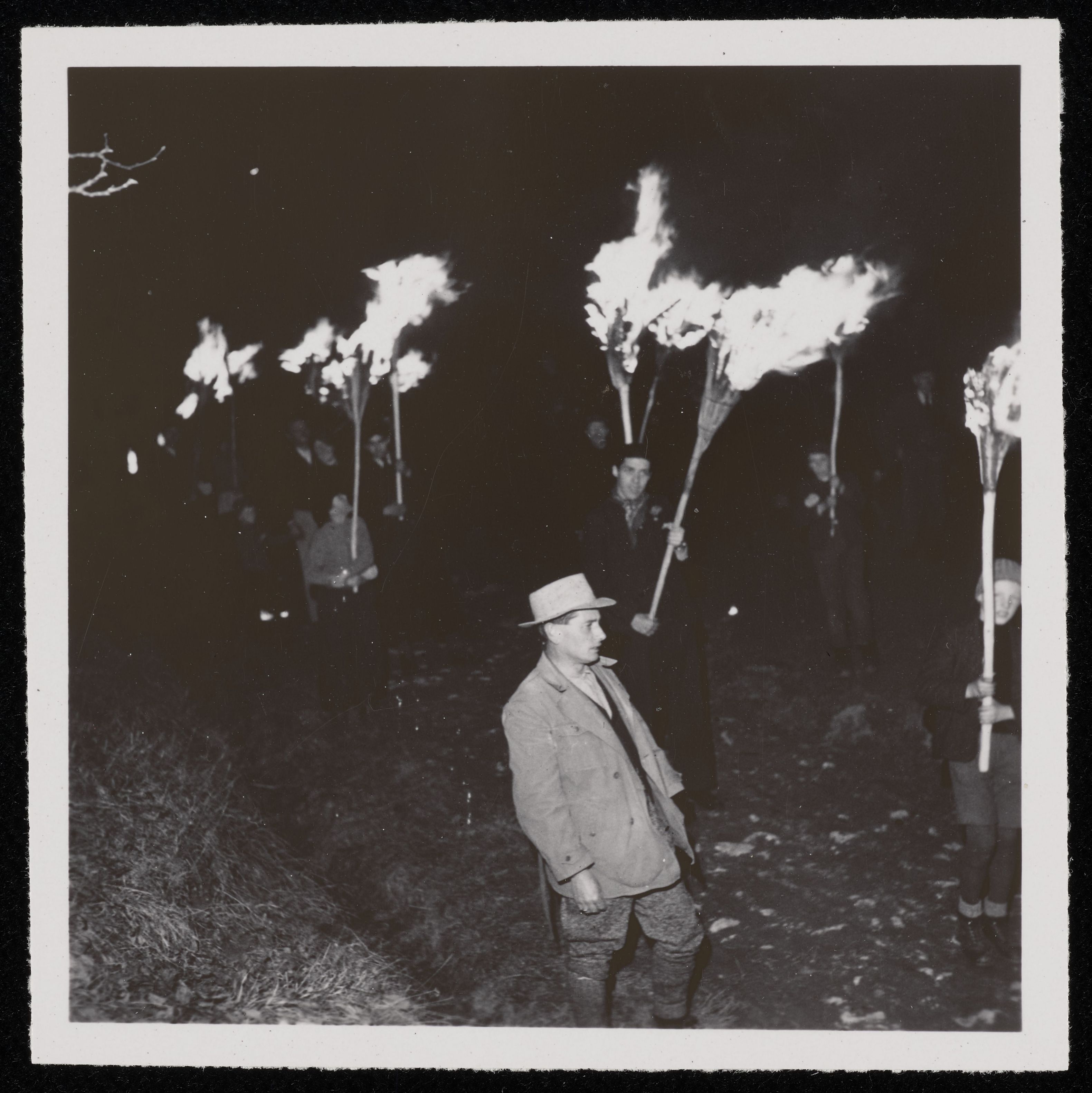 [Personen tragen grosse brennende Holzstrukturen ähnlich einem Besen]