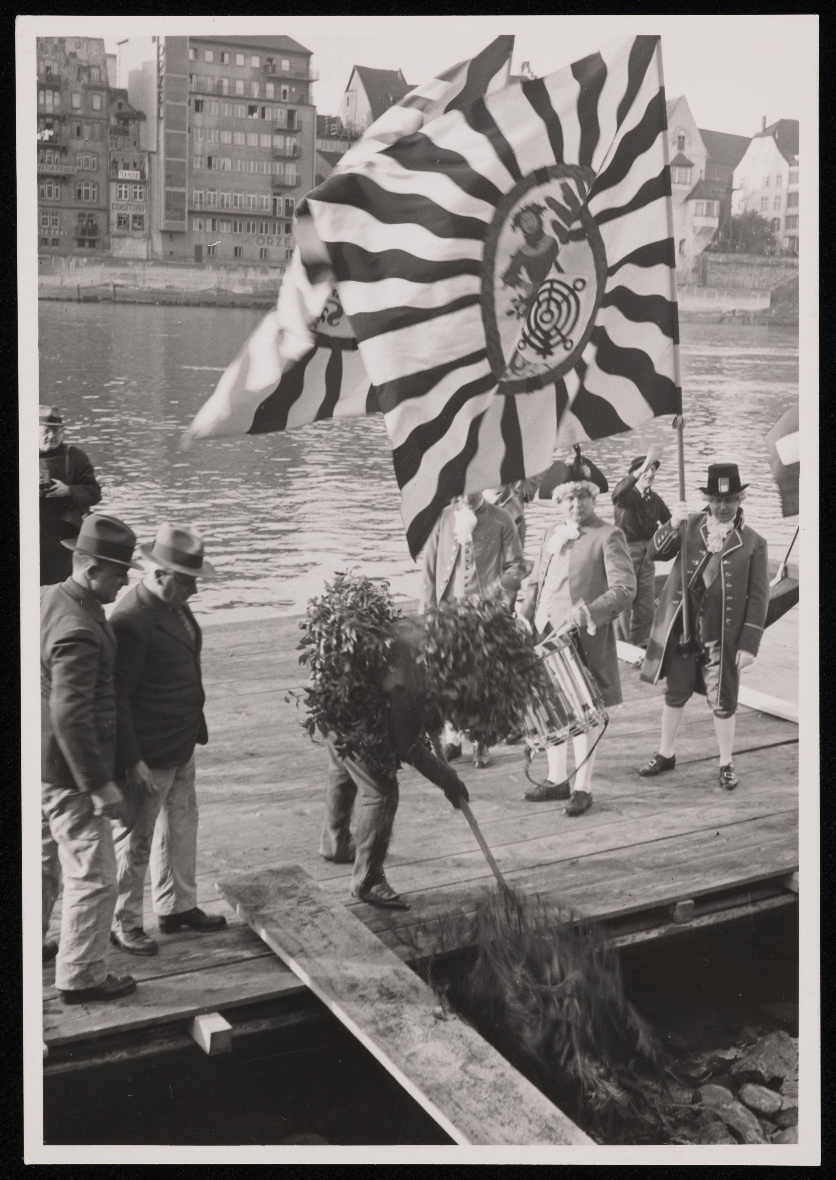 [Das Boot des wilden Mannes landet am Rheinufer an]
