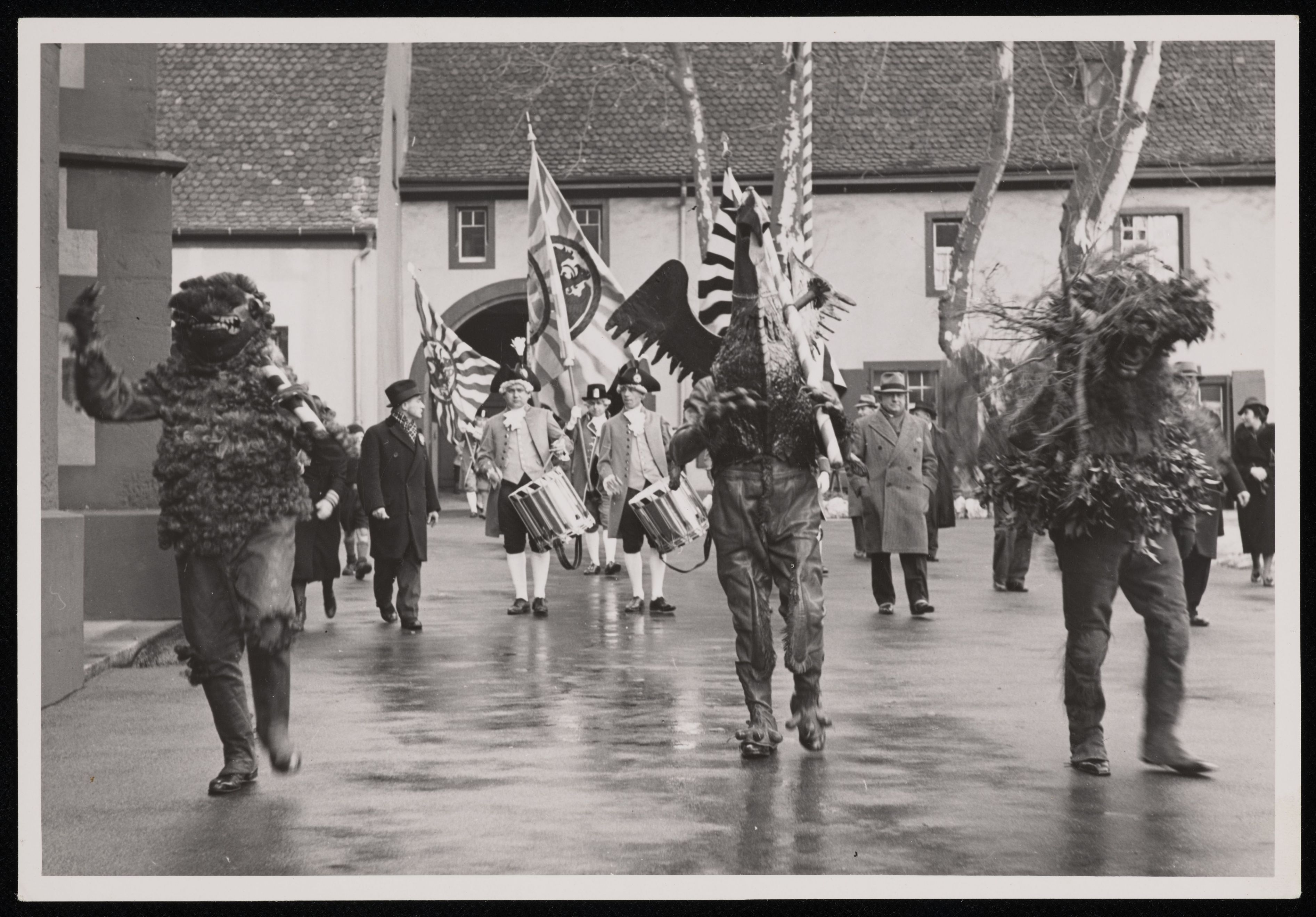 [Vogel Gryff, Leu und Wild Maa an Vogel Gryff mit Spiel im Hintergrund]