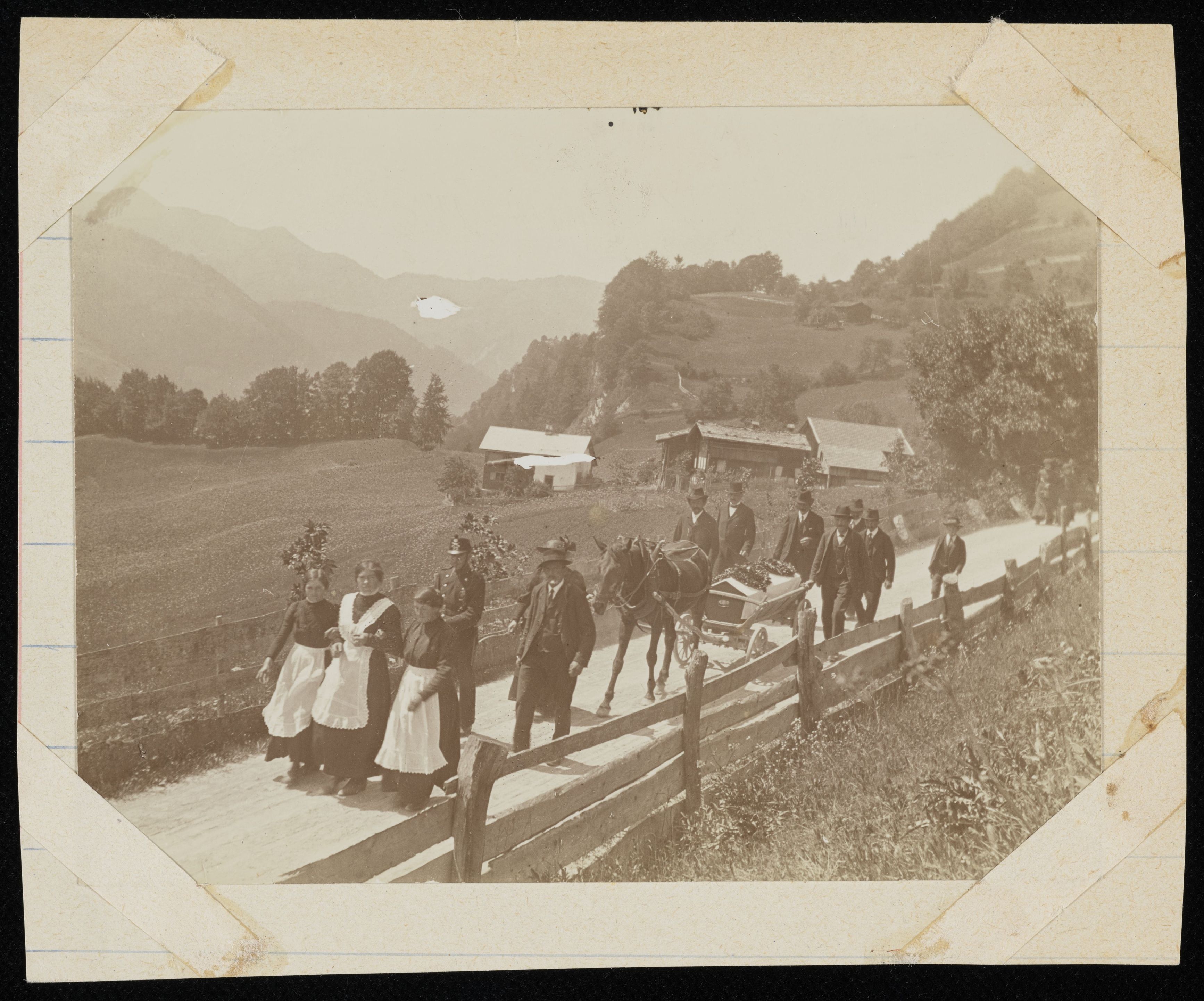 [Personen in Festtagskleidung als Trauerzug vor Sarg