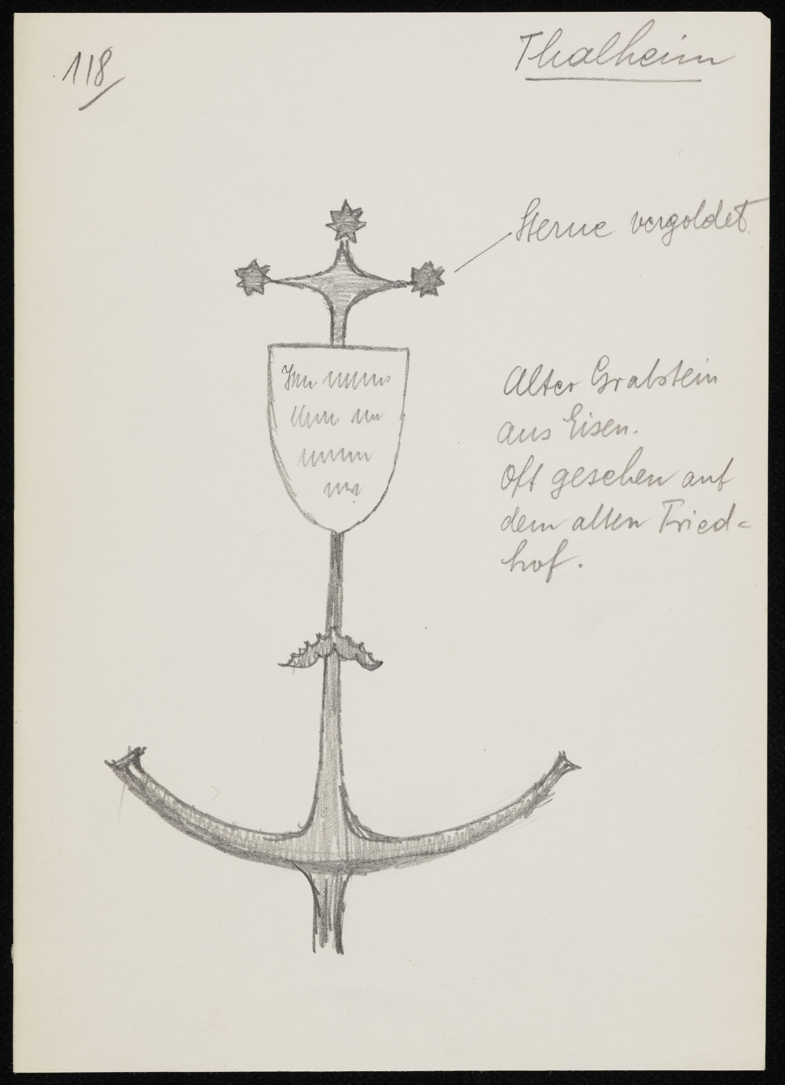 [Bleistiftzeichnung von einem alten Grabstein aus Eisen]