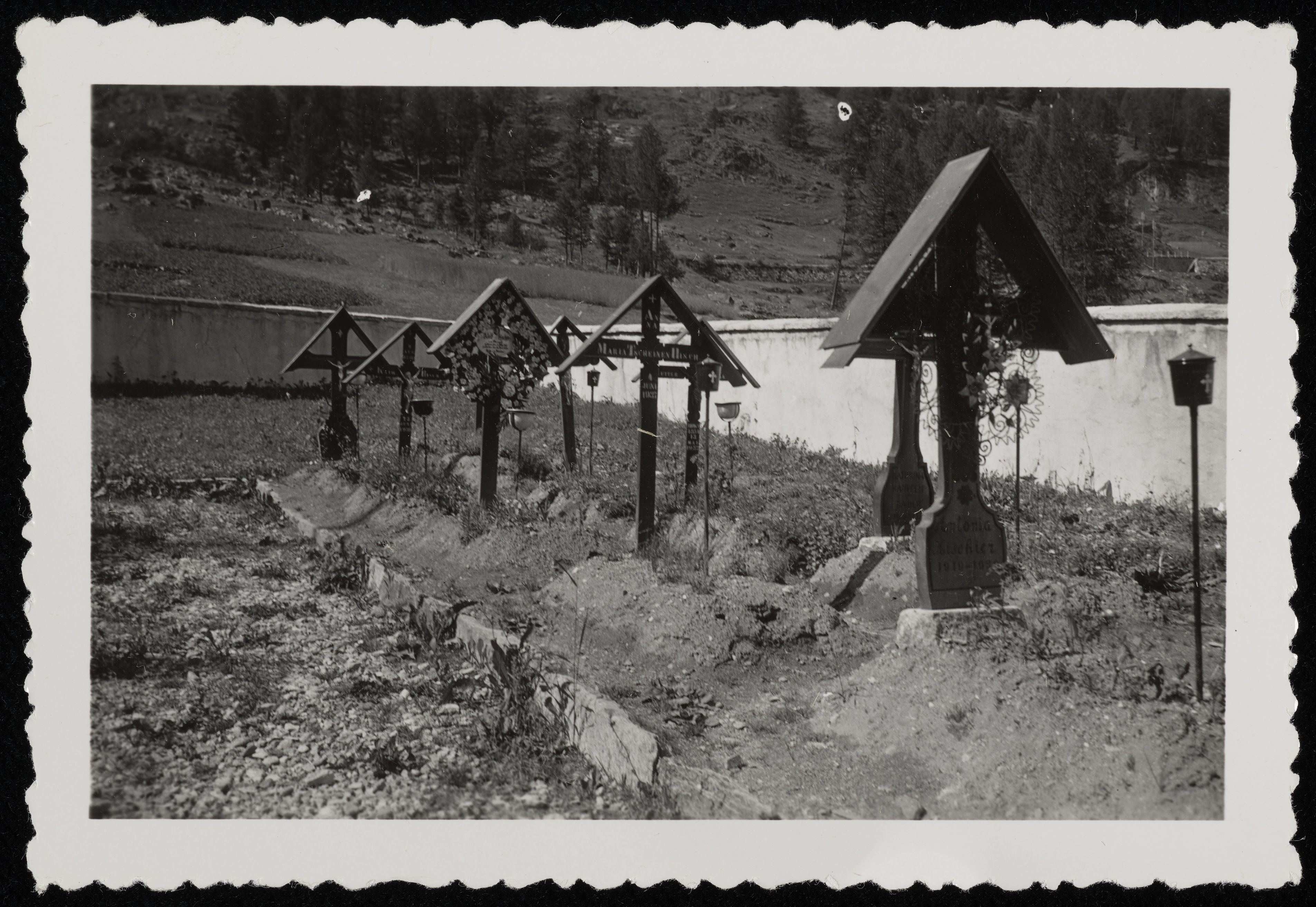 [Friedhof mit Holzkreuzen in den Bergen]
