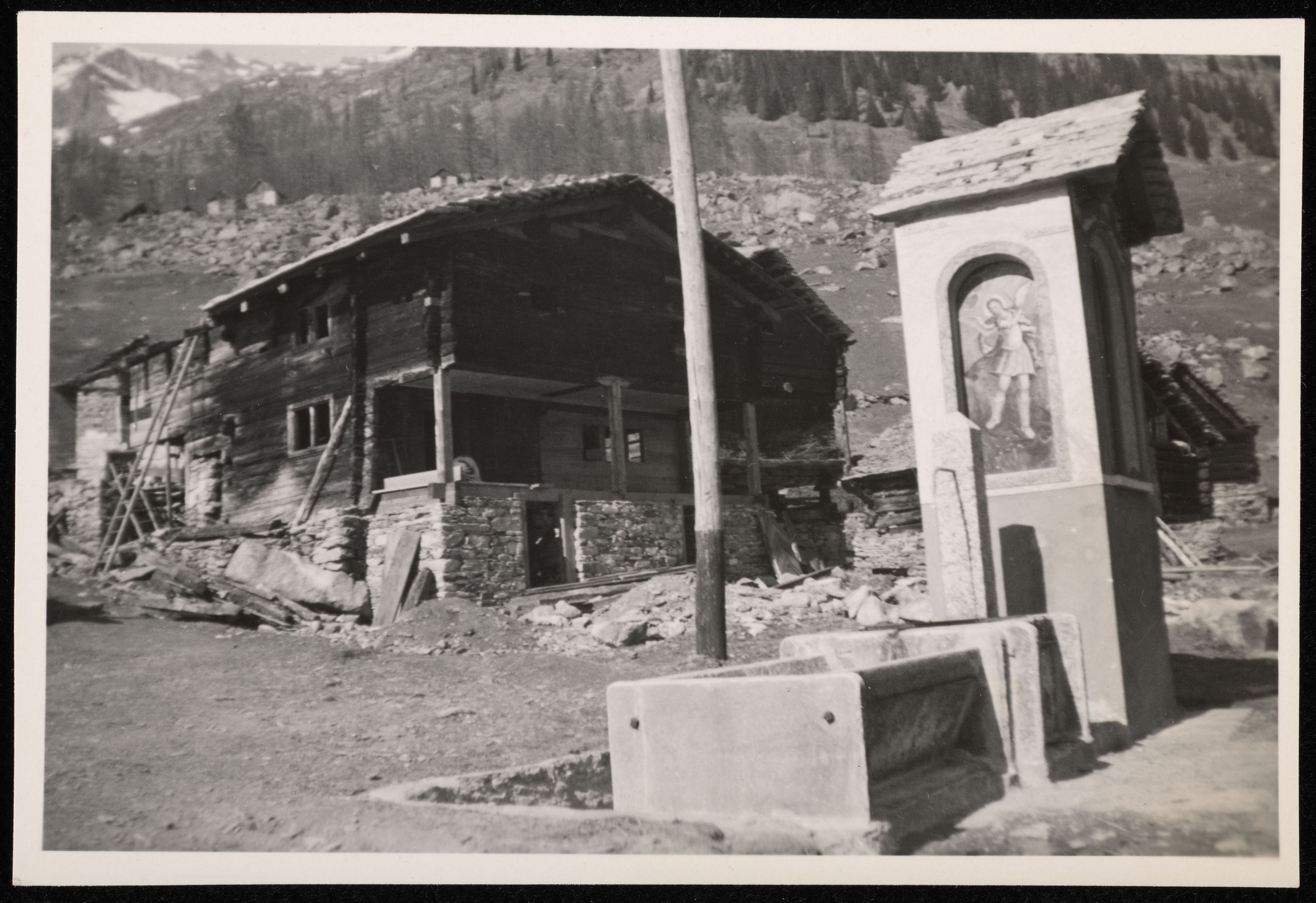 [Kapelle neben einem Brunnen vor einem Haus Reparatour in Bosco Gurin]