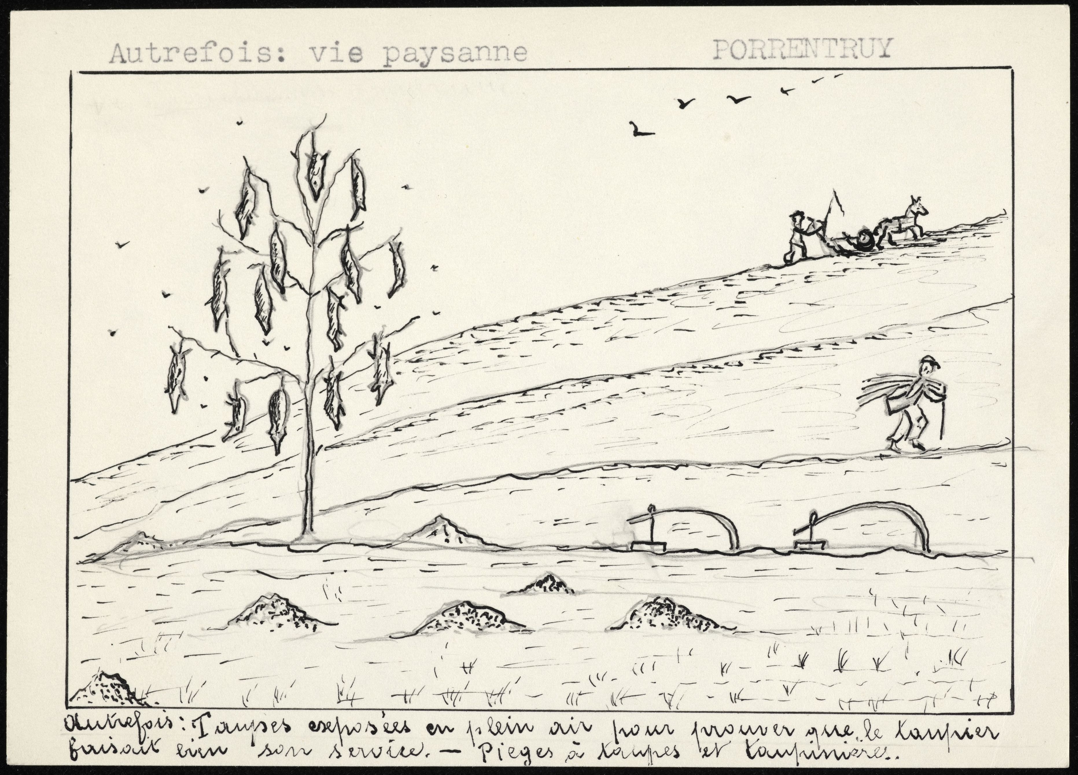 [Zeichnung von Maulwurfsfallen und toten Maulwürfen an einem Baum]