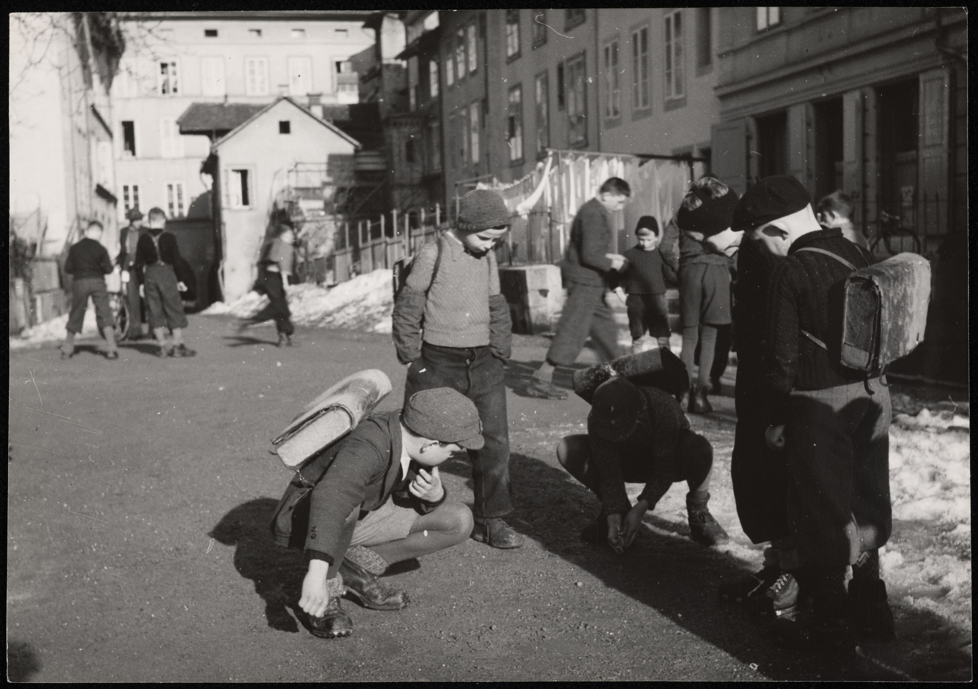 [Kinder mit Schulranzen im Halbkreis versammelt beim Murmelspiel]
