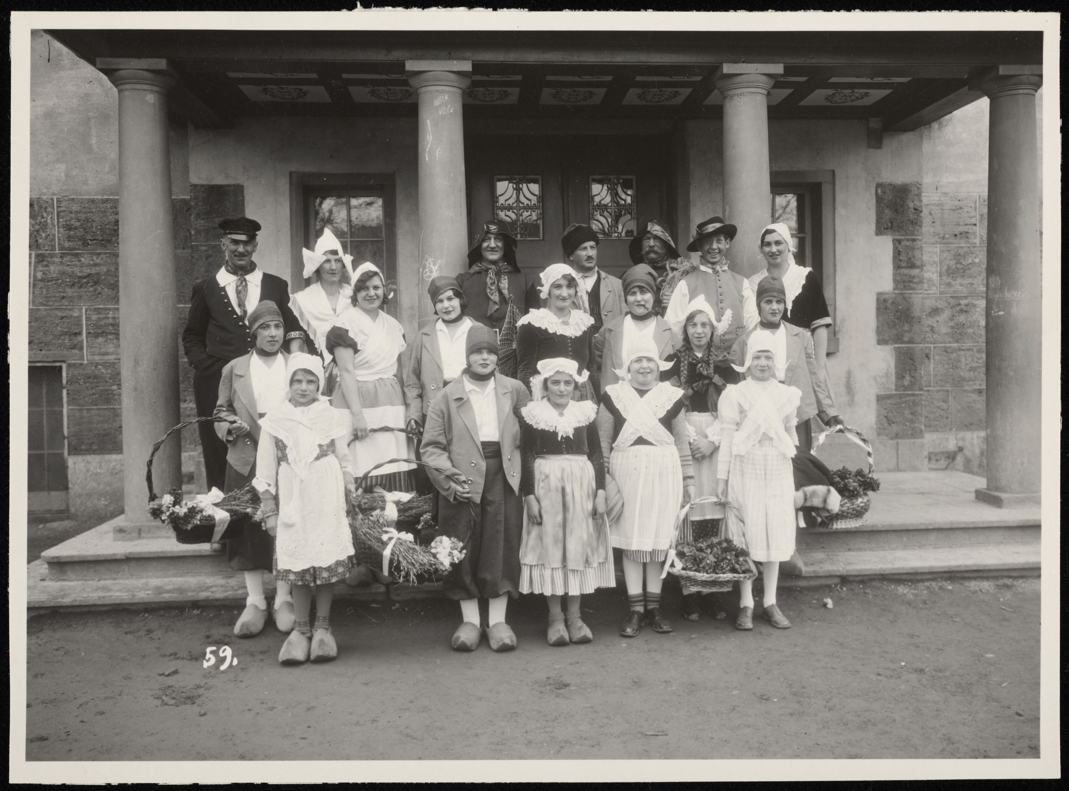 [Verkleidete Personen vor einem Haus]