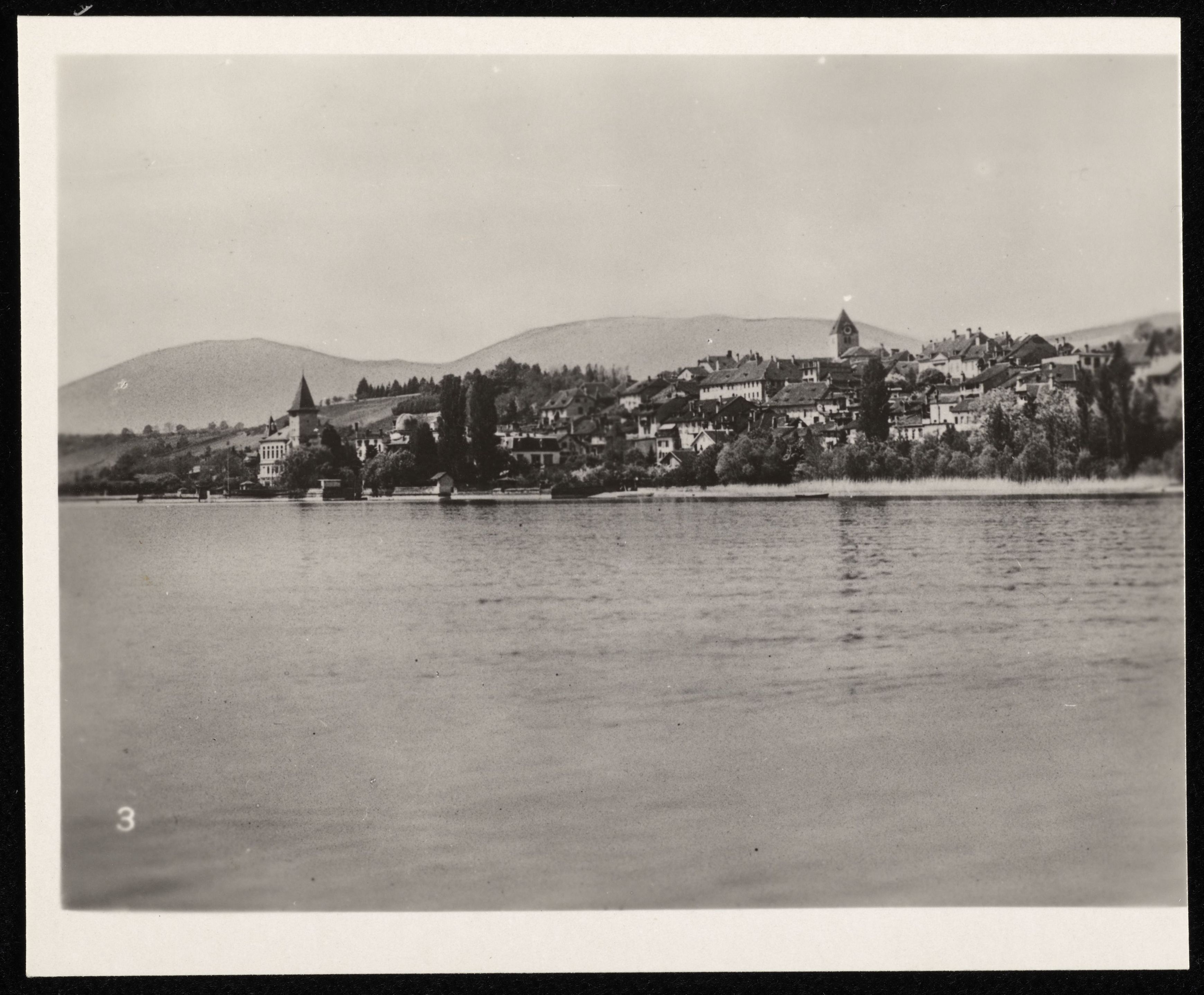 [Blick über den Lac de Neuchâtel auf Grandson mit Kirche und Schloss]