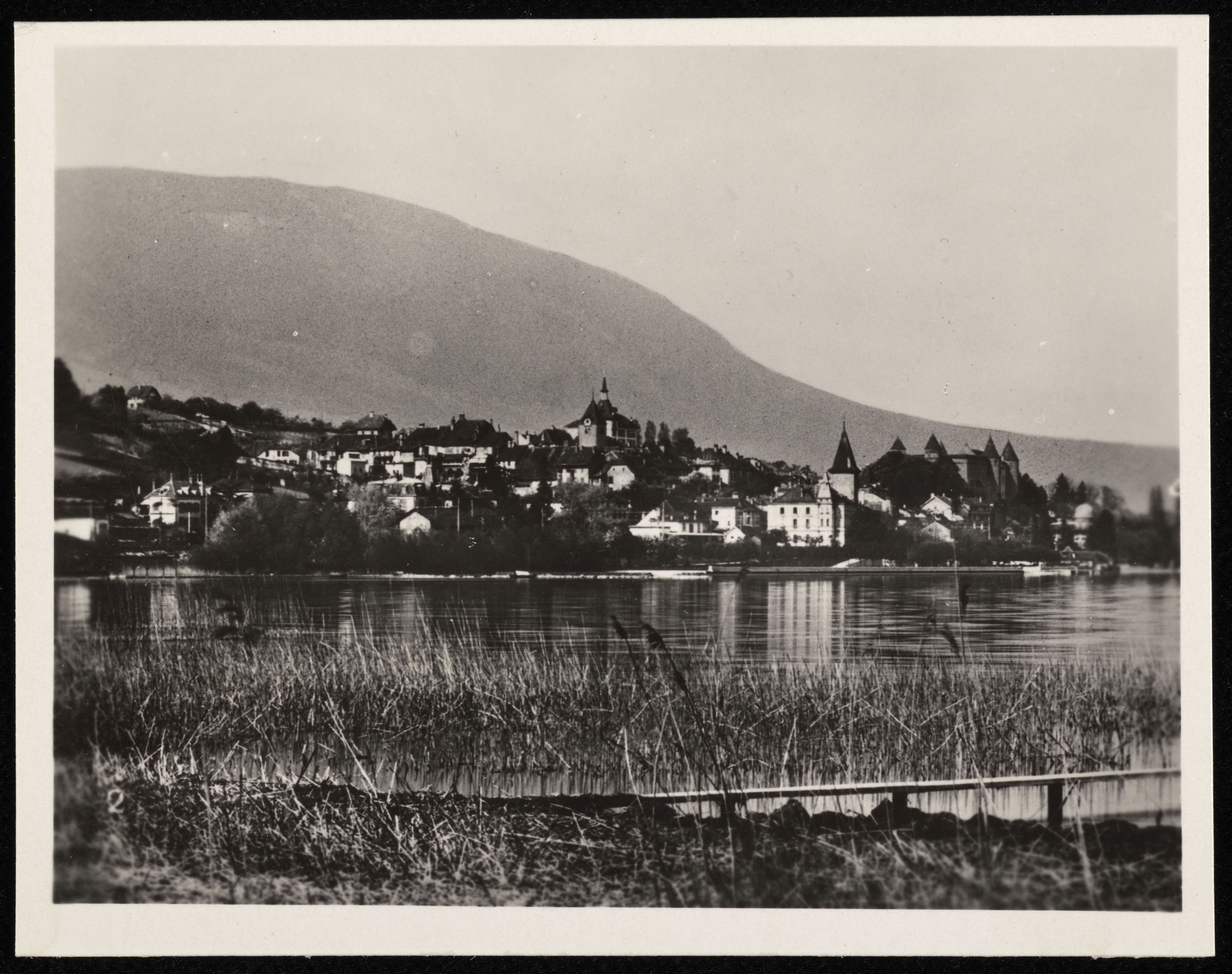 [Blick über den Lac de Neuchâtel auf Grandson mit Kirche und Schloss]