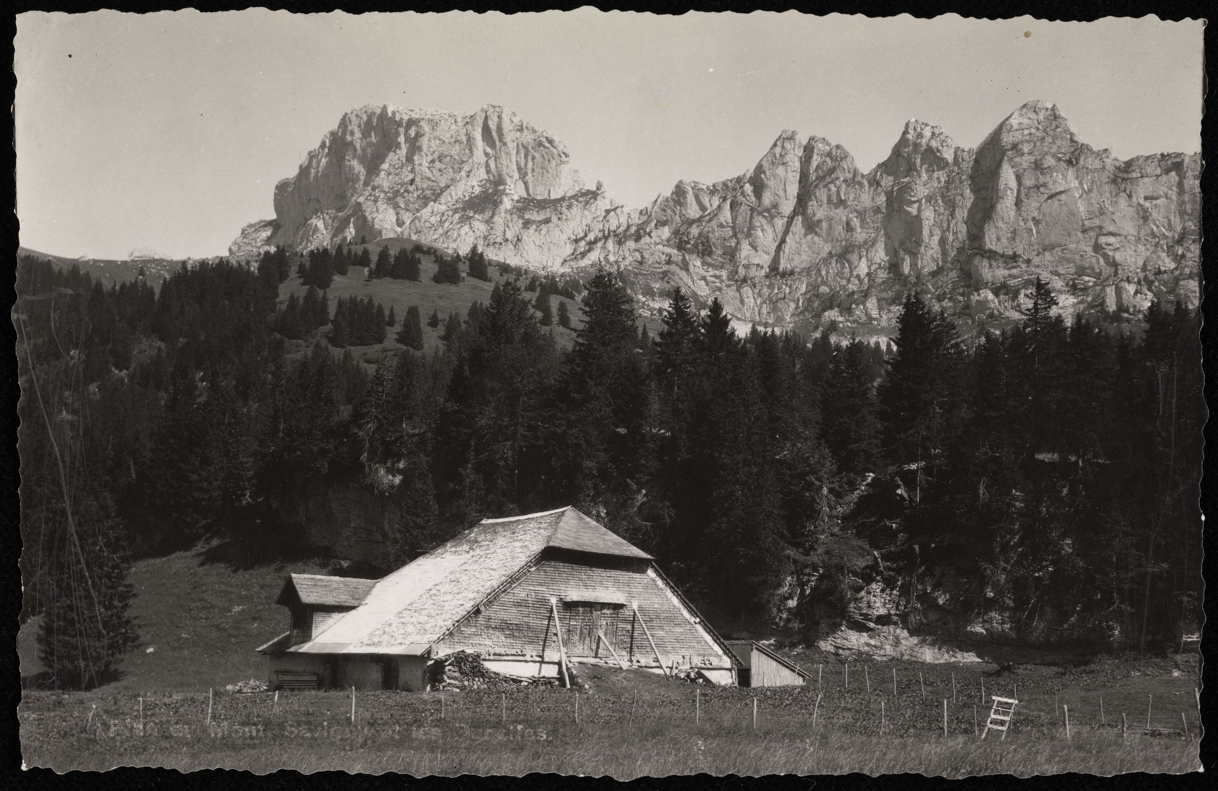 [Alphütte mit tiefem Schindeldach bei Charmey]