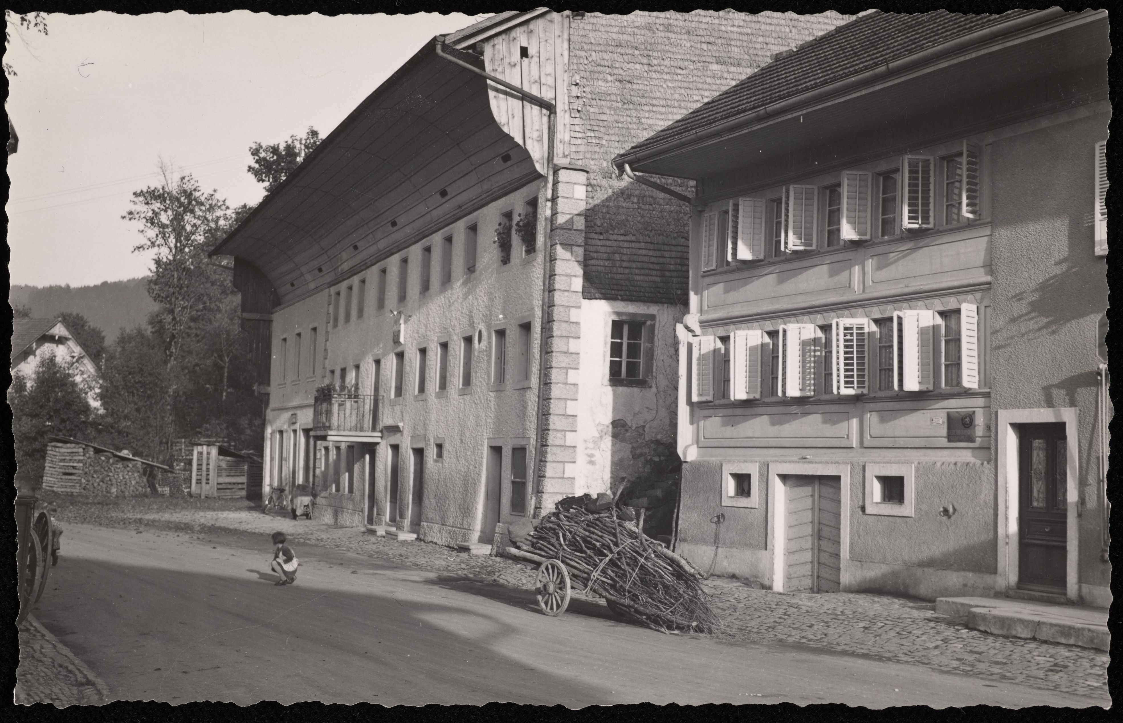 [Strasse in La Roche mit Kindern und Bauernhaus]