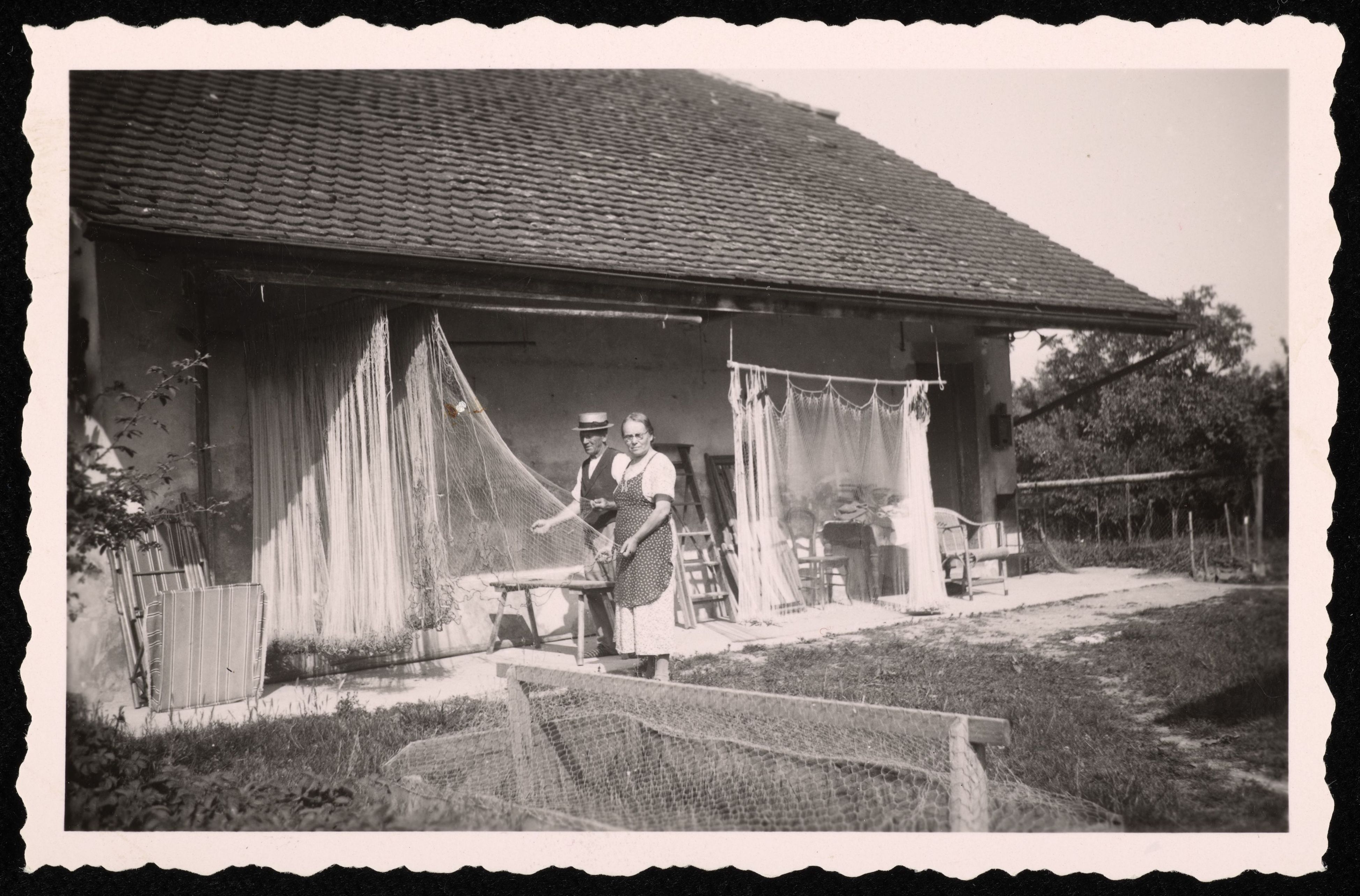 [Zwei Personen entwirren Netze nach dem Fischen]
