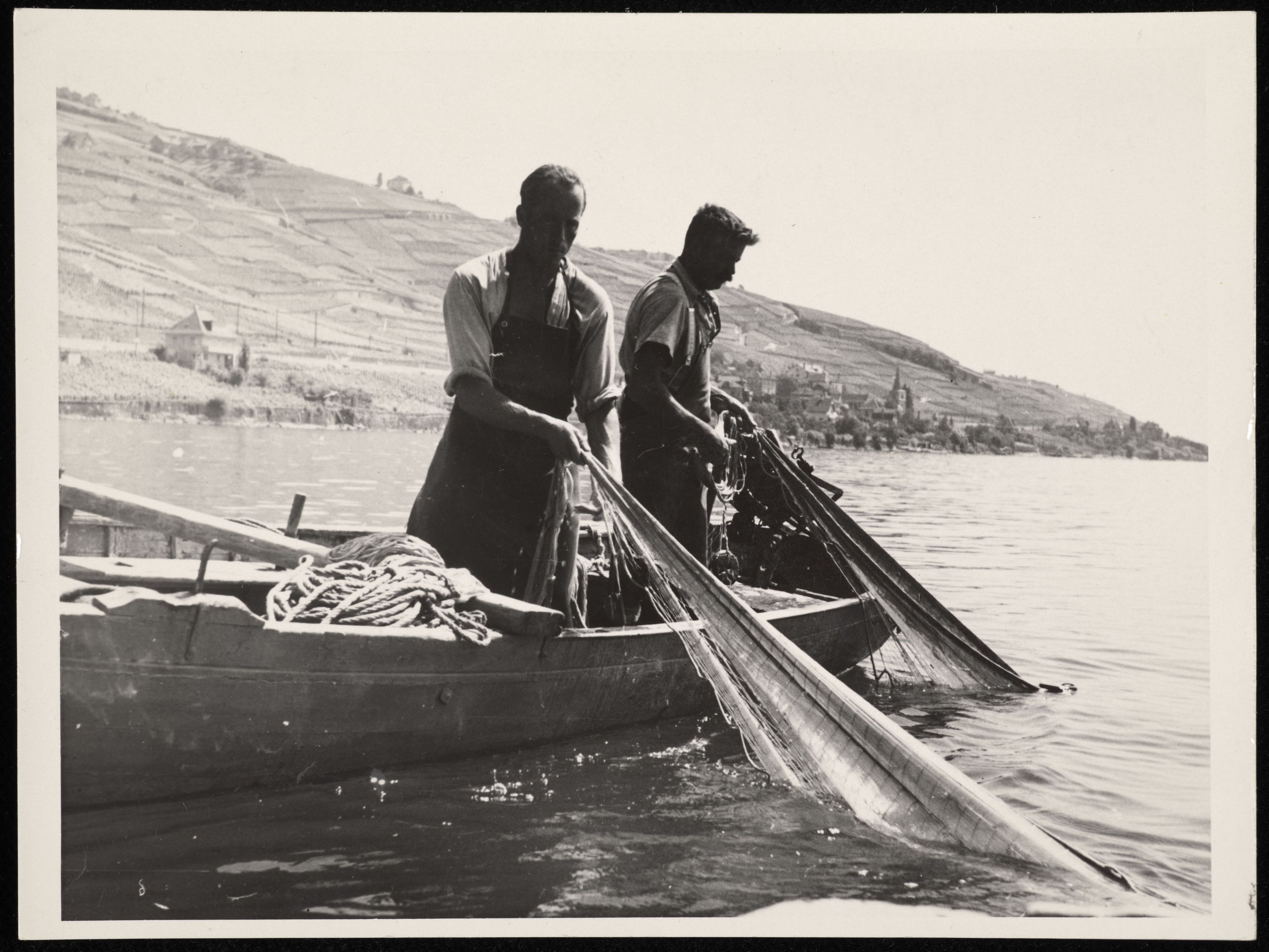 [Zwei Fischer auf einem Boot beim Einholen von Netzen]
