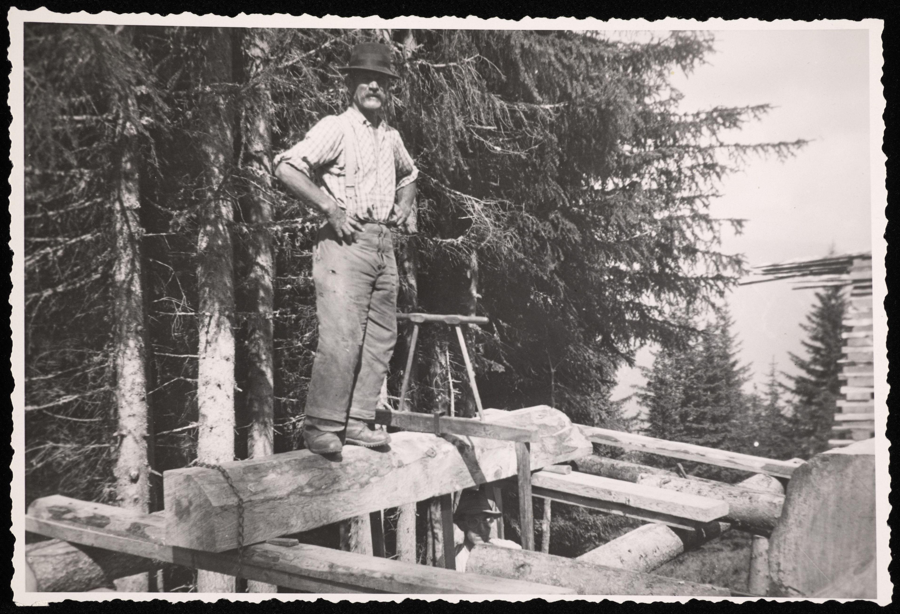 [Person beim Bau einer Almhütte mit einer Säge (Bambanen)]