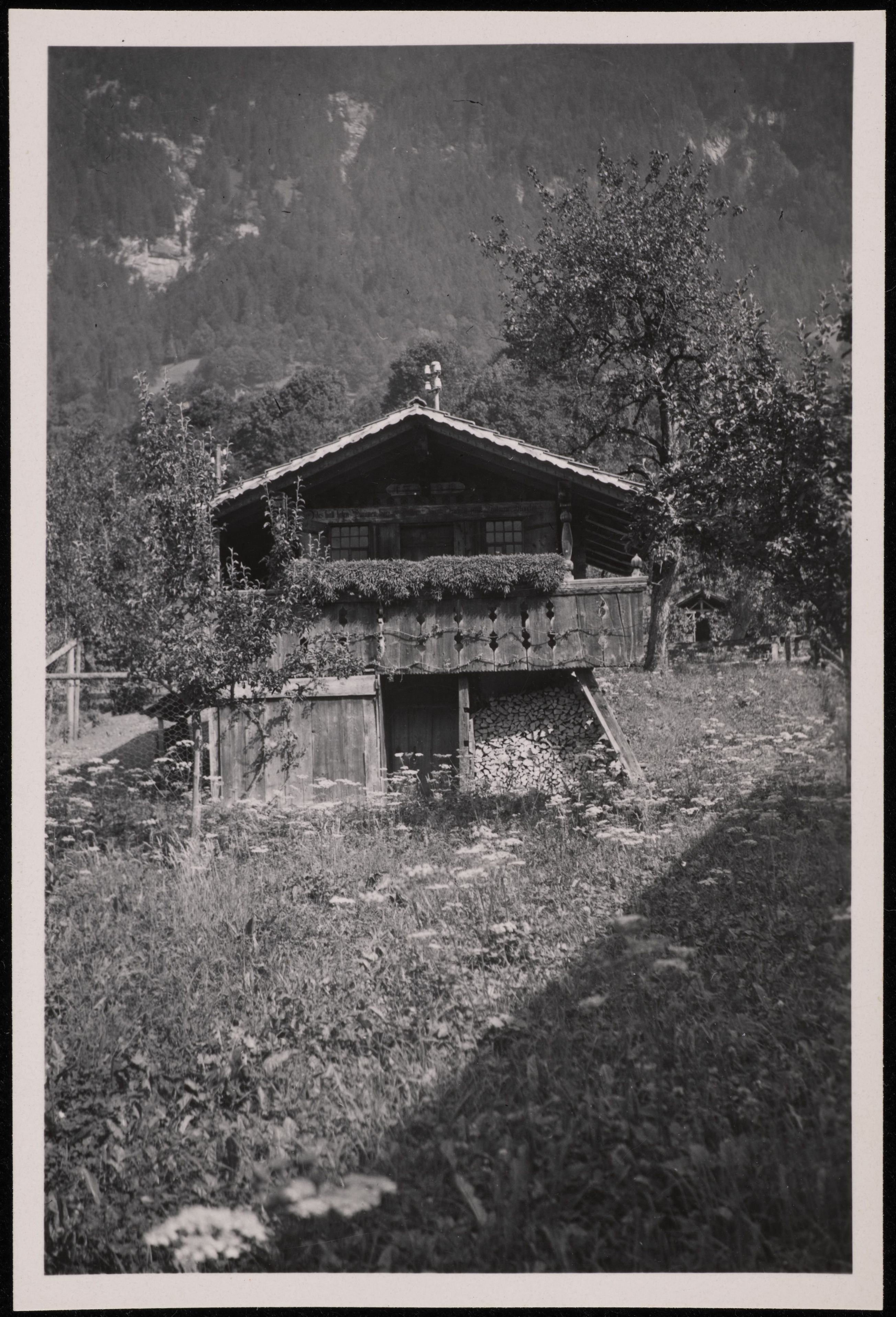 [Kleines Holzhaus mit Balkon auf Wiese]
