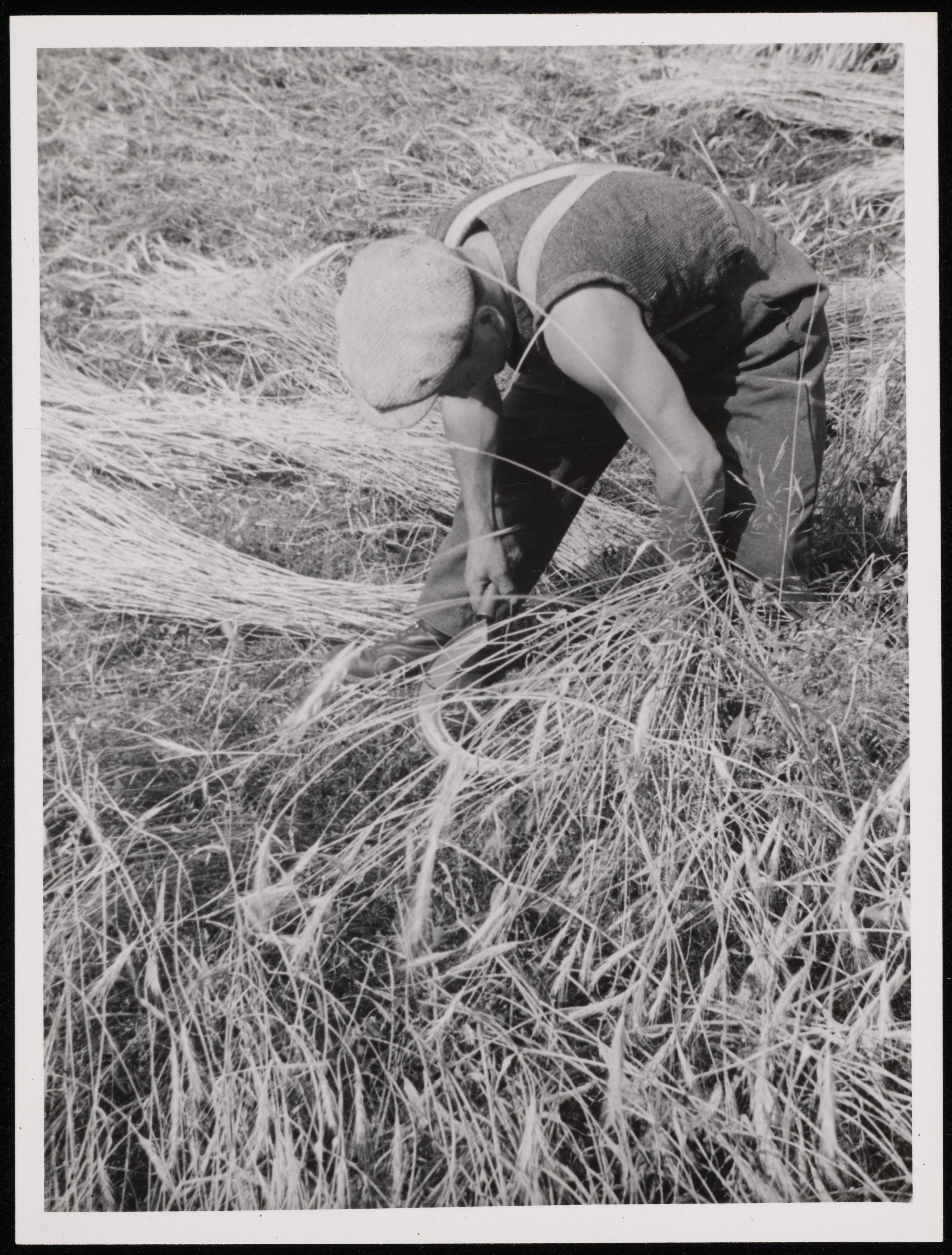 [Mann schneidet Gras mit einer Sichel]
