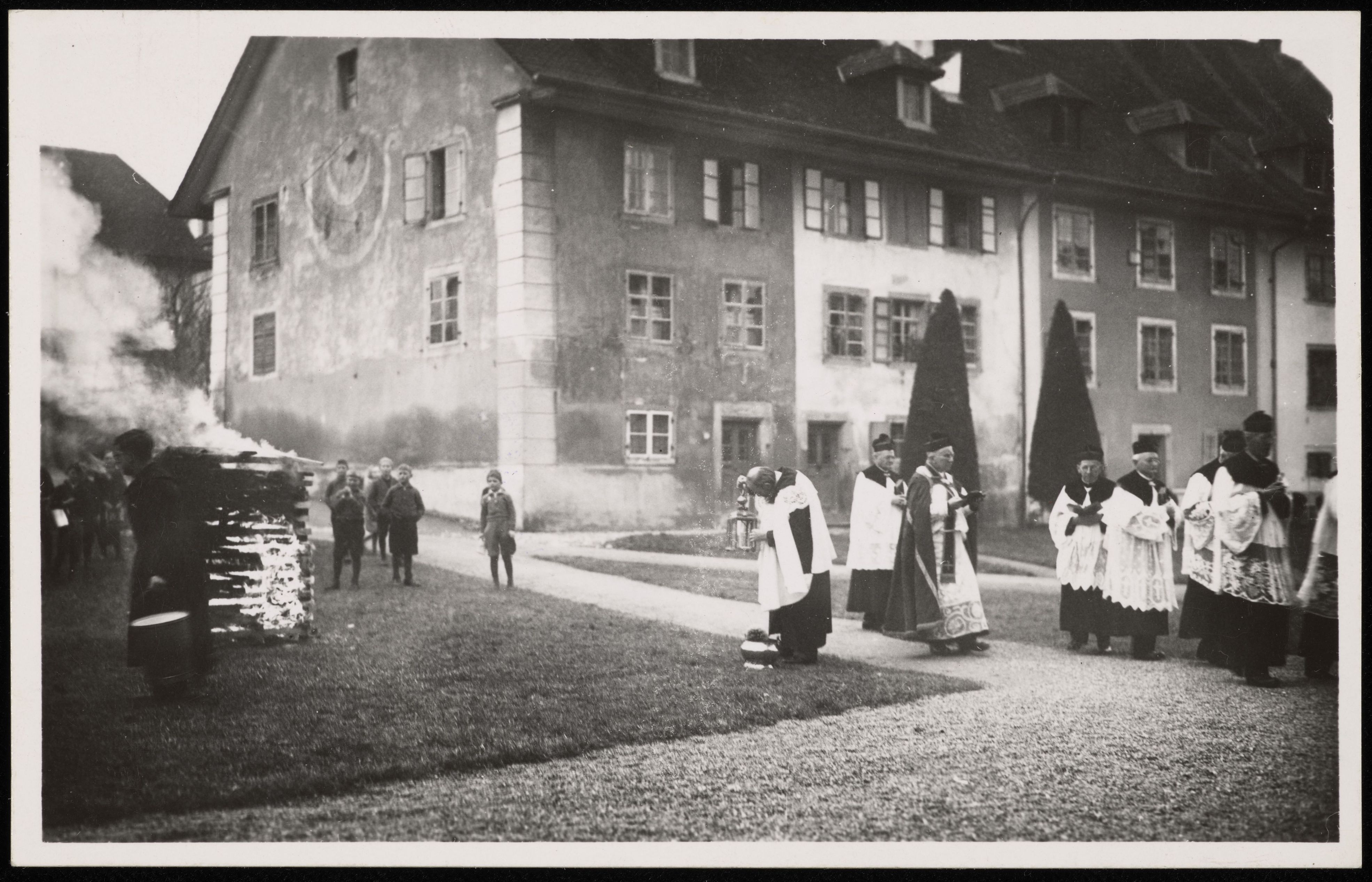 [Katholische Priester neben einem Feuer vor einem Gebäude]