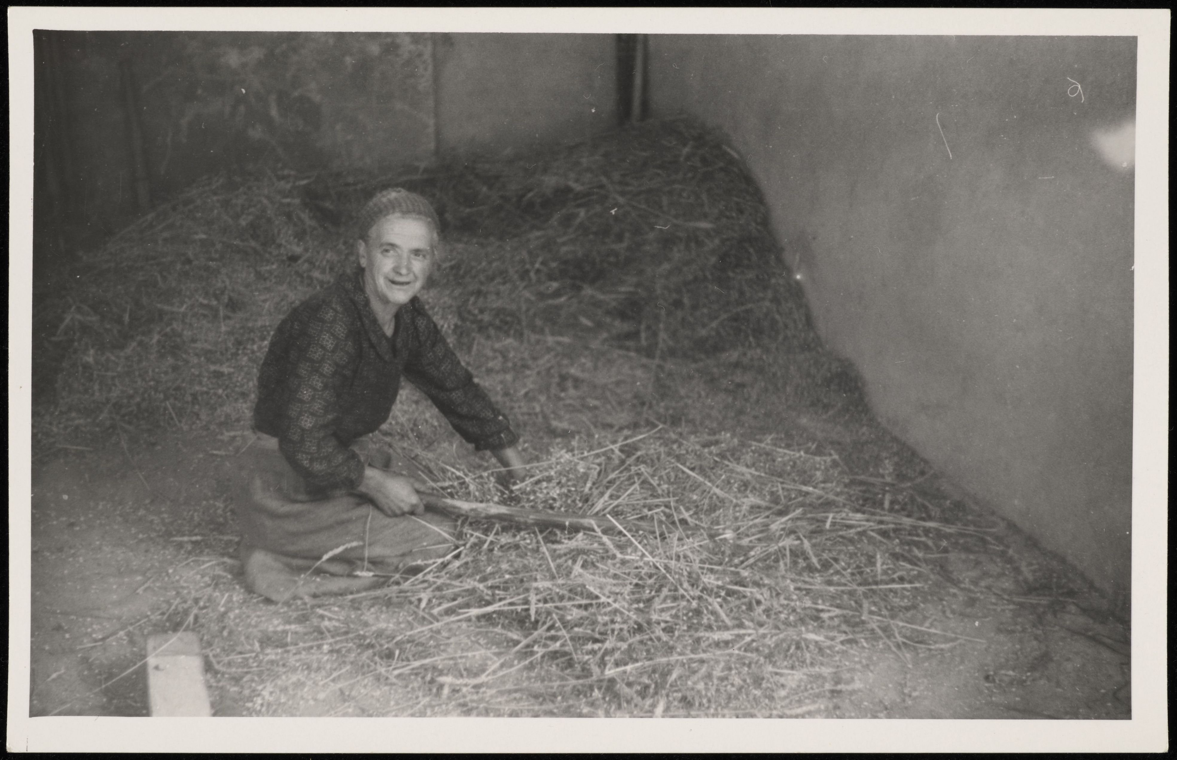[Frau sitzt beim Heuen]