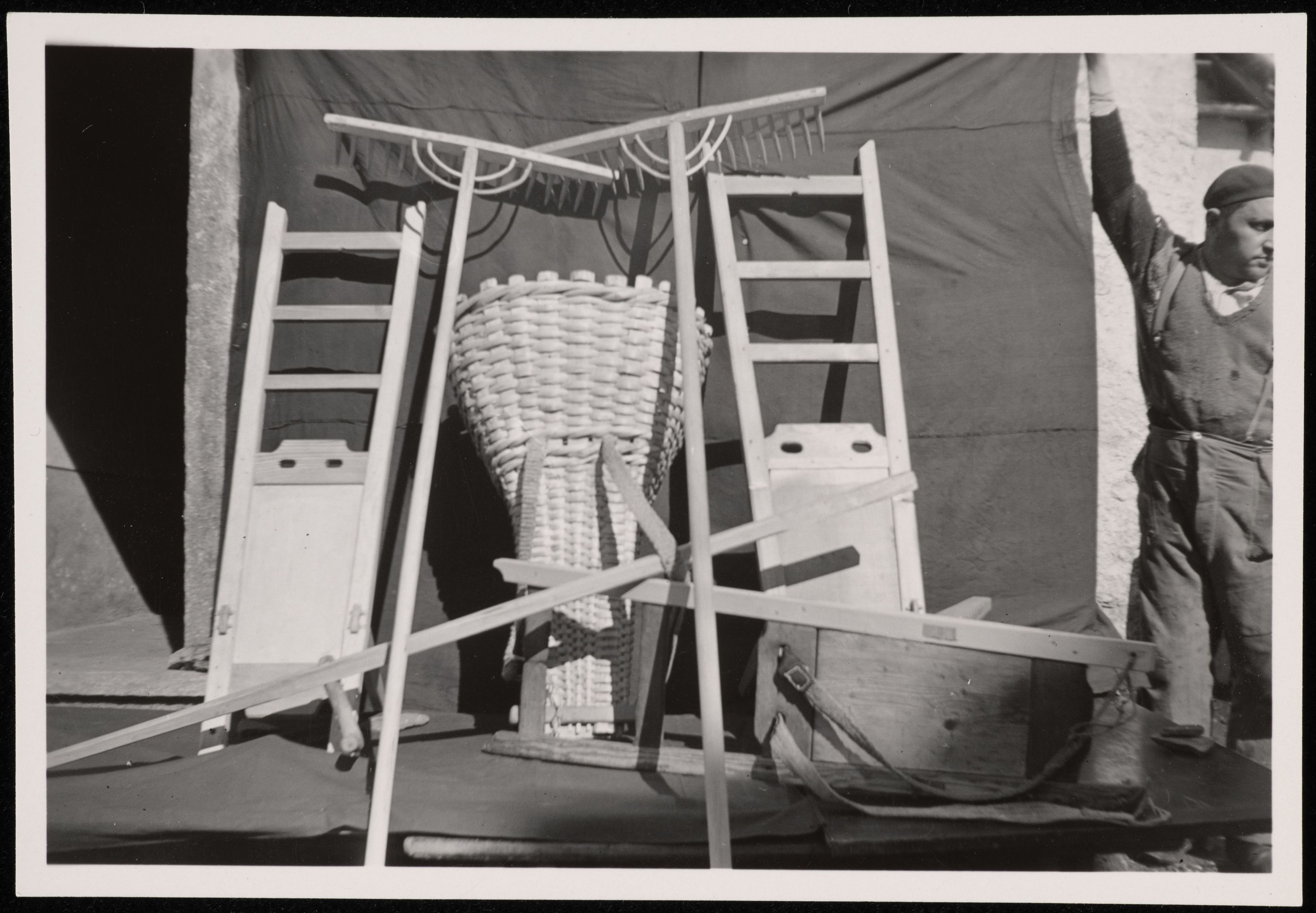 [Rechen und Körbe vor einer Leinwand]