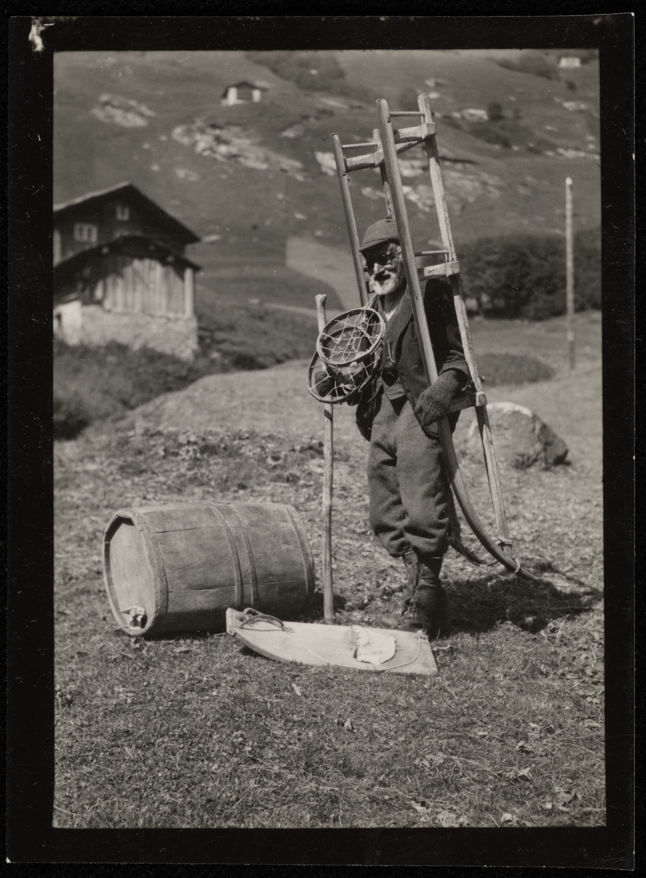 [Bergträger mit Schlitten, Schneereifen, Stock und Reitbrett]