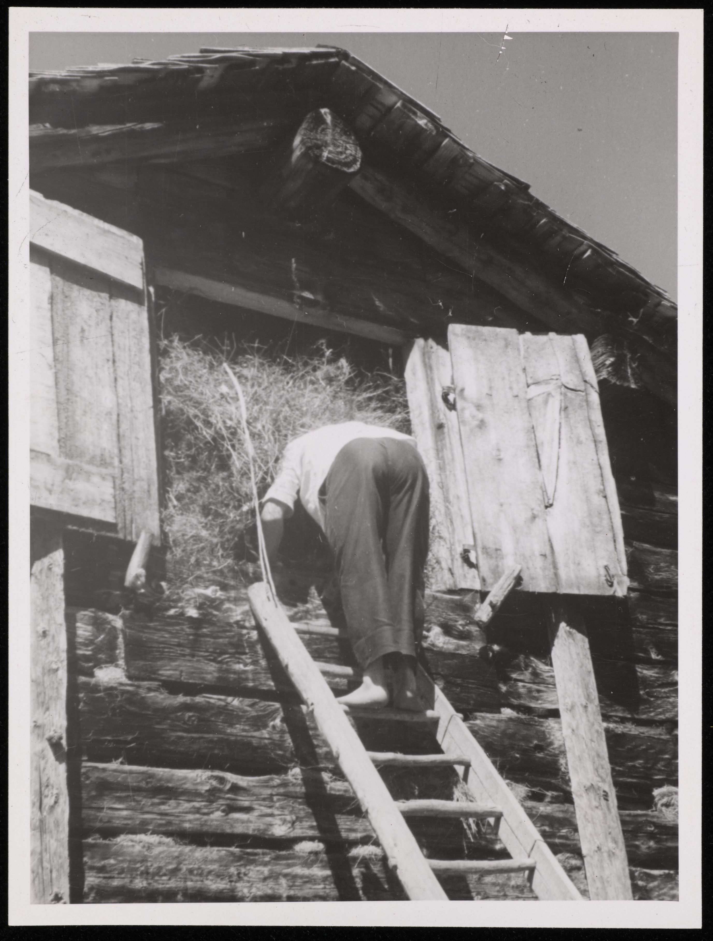[Person steht auf einer Leiter zu einem Raum voller Heu]