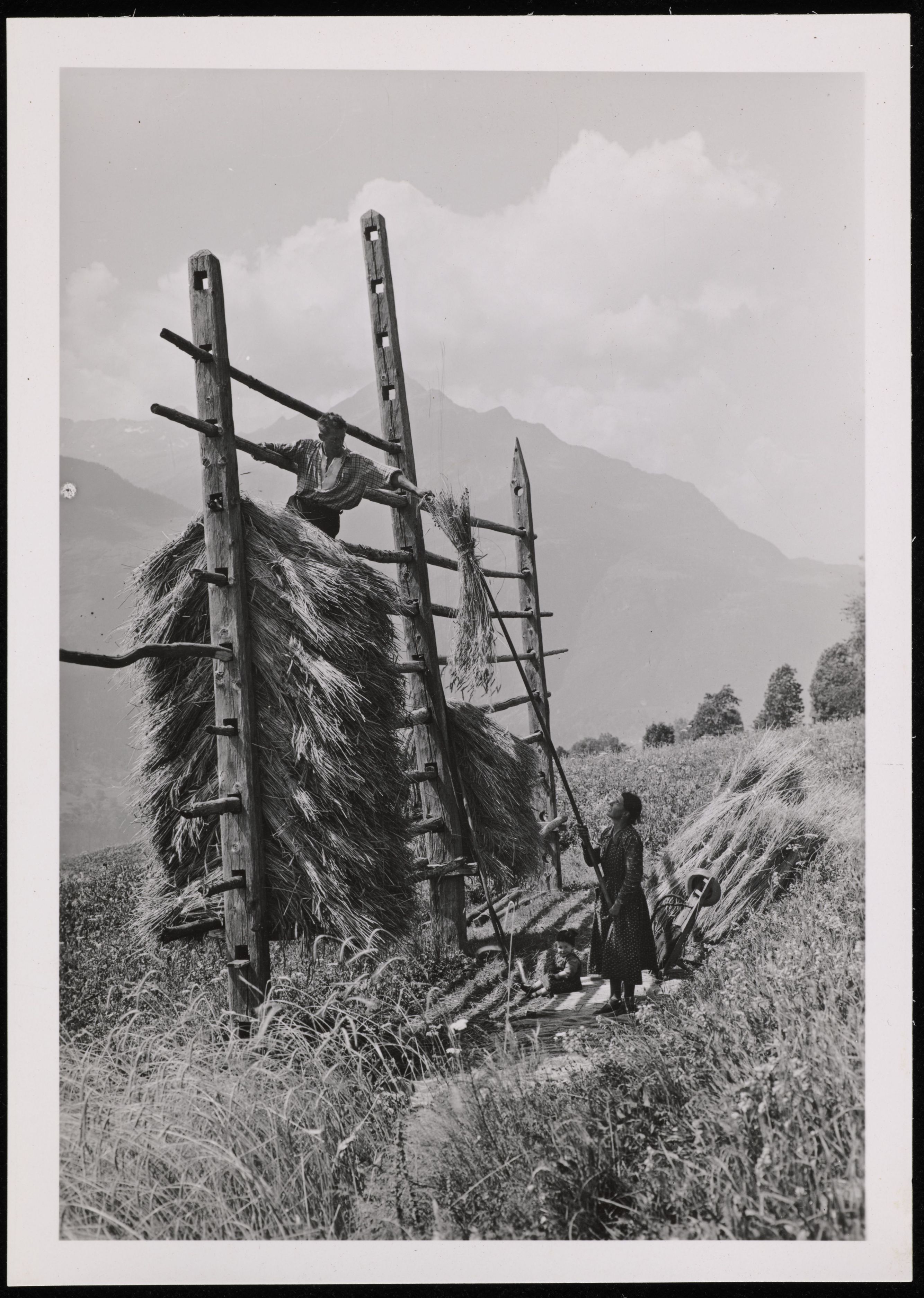 [Hölzerne Heuraufe zum Trocknen wird befüllt]