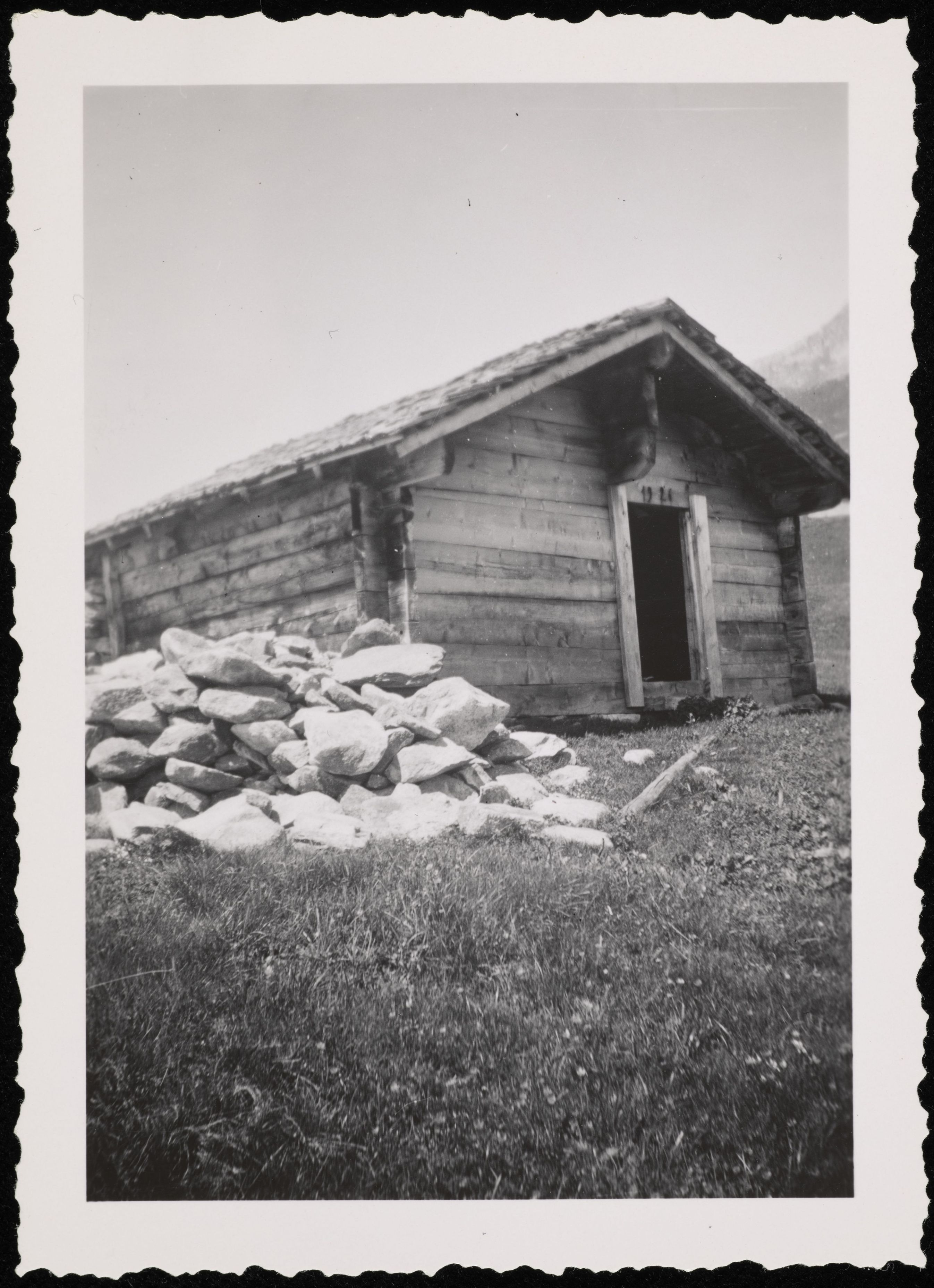 [Holzhütte neben Steinhaufen]